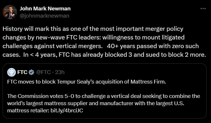 Hospital Monopolies Last week Justin wrote about hospital monopolies and this week it was reported that one of the most powerful, The University of Pennsylvania Medical Center, spent millions leasing a private jet to take trips around the globe just months before laying off over 1,000 people. Some Good NewsJury sides with football fans In my last piece I told you to keep an eye on an important antitrust lawsuit against the National Football League and the following week the NFL was found guilty of violating antitrust laws, which will mean big changes for fans. Repair Independence Day Monday was “Repair Independence Day” celebrating that right to repair laws were going into effect in two state (Minnesota and California). While the laws include some unfortunate carveouts, such as farm equipment, this represents a big step in breaking up the tech monopolies that want to control the stuff you own. FTC Cracking Down on Vertical Integration The FTC under the leadership of Lina Khan continues to make huge strides in reinvigorating our antitrust laws. This week the FTC vote unanimously (remember the commission has bipartisan representation) to challenge a vertical merger in the mattress industry, which is a big deal for reasons that span well beyond that particular industry. BEFORE YOU GOBefore you go, I need two things from you: 1) if you like something, please share it on social media or the next time you have coffee with a friend. 2) Ideas, if you have any ideas for future newsletter content please comment below. Thank you. Standing Tall for All, J.D. Scholten |