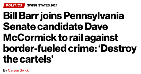 "Former US Attorney General William Barr and other Republican leaders hit the campaign trail this week — not to promote any candidacies of their own but to lend a hand to Pennsylvania Senate candidate Dave McCormick, who remains behind Democratic Sen. Bob Casey in the polls." |