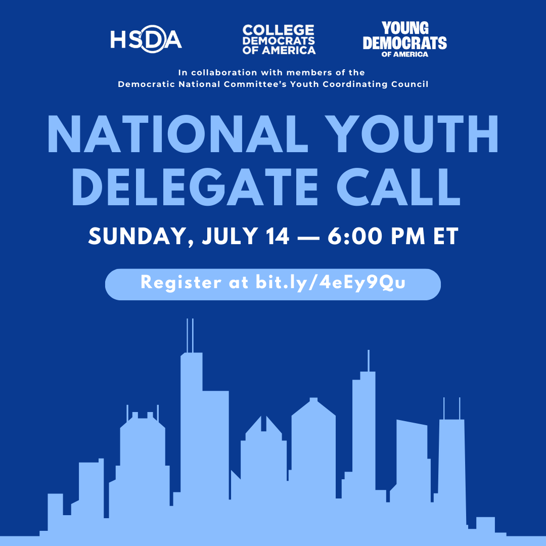 Are you a young Delegate or Alternate to the 2024 Democratic National Convention? Join us on July 14 at 6:00 PM ET for a National Youth Delegate Call hosted by HSDA, CDA, and YDA. Connect with fellow delegates, learn about the convention experience, and discuss key updates and critical issues. Register for the call by clicking this link.*