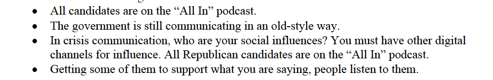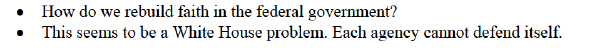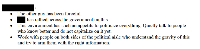 In summary, the Brennan-Clapper-led DHS intel group had a full-length discussion about manipulating the optics of their political messaging to the American public. They suggested various ways to use the government to launder their political messaging through other channels, including co-opting political leaders, social media companies, and media outlets they perceive to be trusted by their political opponents.