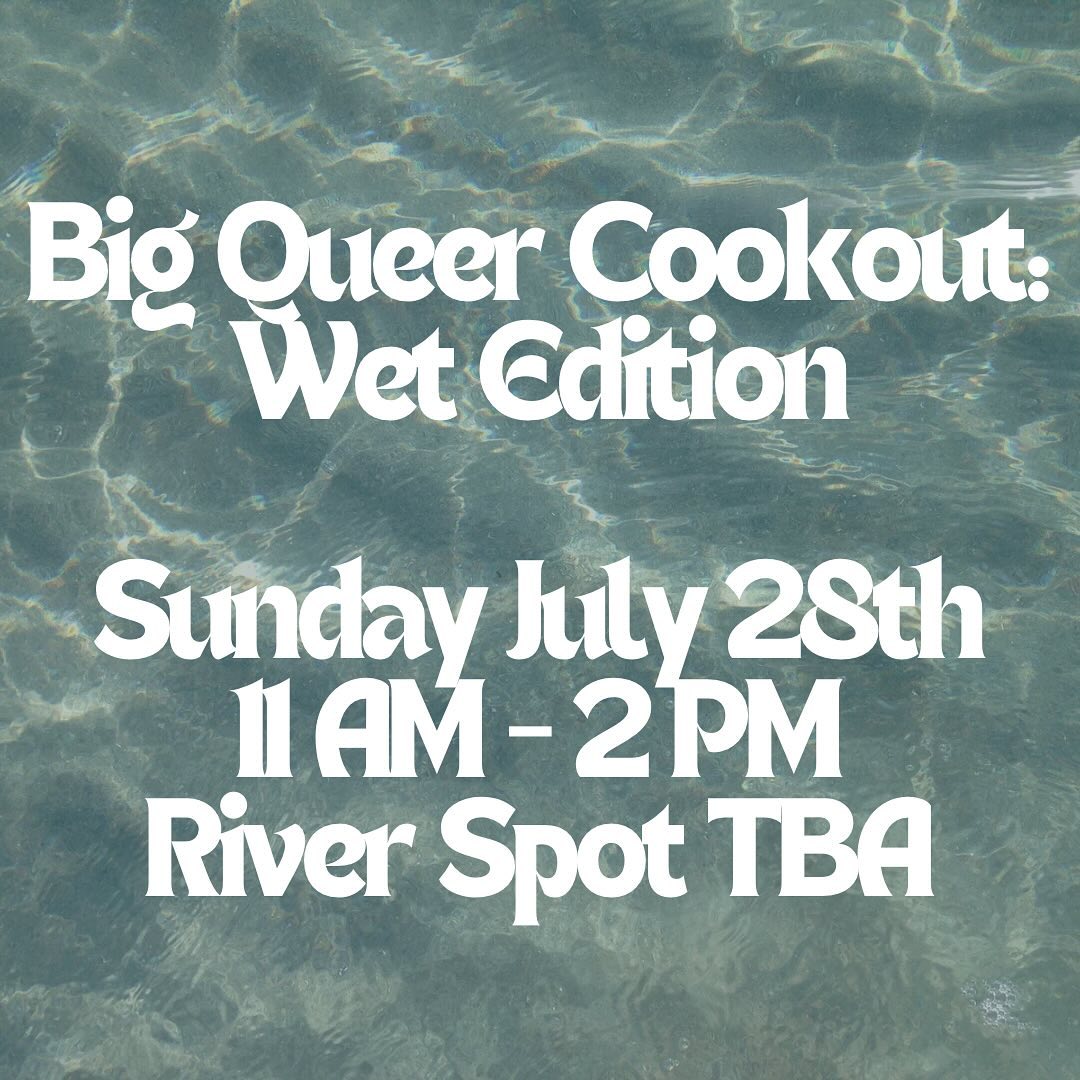 Sunday, July 28th, 11am - 2pm River location TBA. Follow @bigqueercookout on Instagram for timely updates.