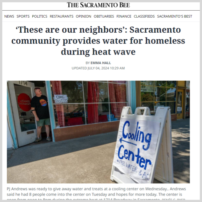 Over the past week during the ongoing heat wave, Sacramento DSA has been hosting a cooling center in partnership with Organize Sacramento. We've provided water, drinks, and snacks to over 300 people who've sought respite from the brutal heat. The Sacramento Bee covered it in a recent story.