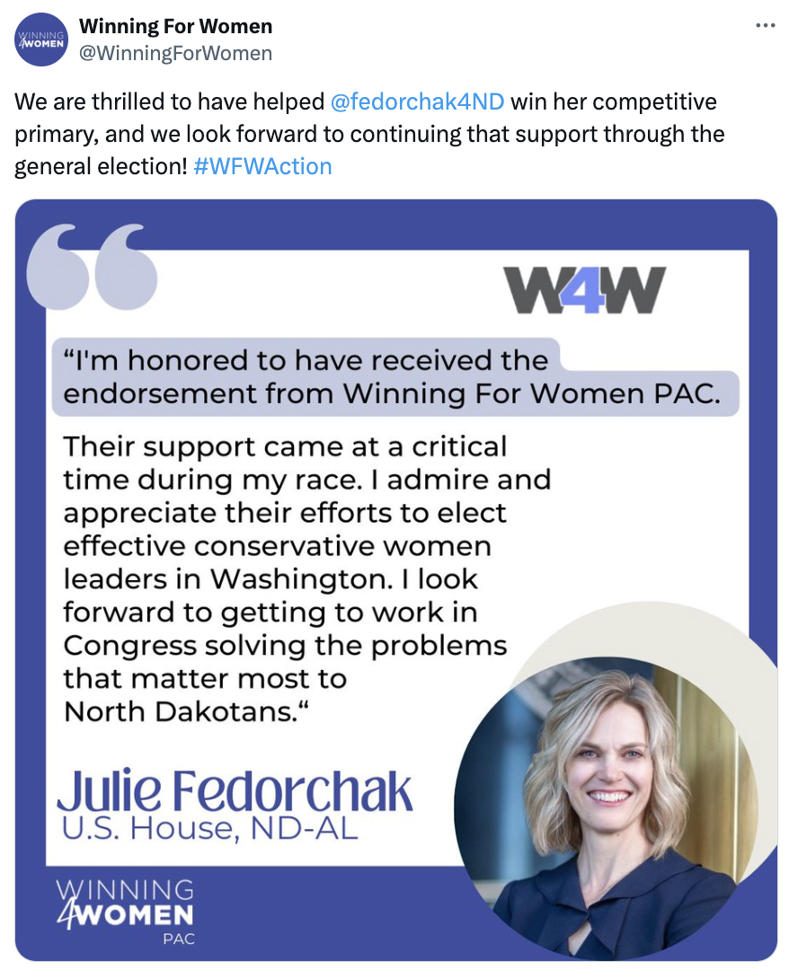 We highlighted a recent victory for one of our WFW PAC-backed candidates, Julie Fedorchak, in North Dakota's At-Large Congressional District.