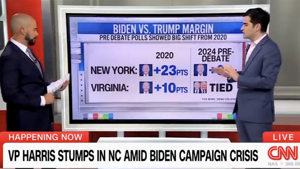How bad are things going for Joe Biden? People are saying New York could be in play bad. No "big boy" press conference is going to fix that. CNN polling guru and harvester or Democrat sorrow Harry Eten looked at recent blue state polls and says that "absolutely" Trump can put reliable blue states in play.