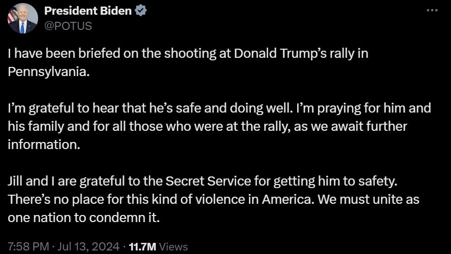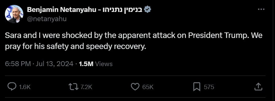 Goldstein For Congress - Please Subscribe and also visit us at www.goldsteinforcongress.com The Attempted Assassination Attempt on former President Trump was a deplorable act. While the details are still coming in, there was a rapid response by the US Secret Service and others in law enforcement. I made this video as I learned of the tragic event just minutes after it happened. There is at least one rally attendee that was killed and my condolences go out to that person’s family and there was at least one other attendee that was badly injured. The fact that this can happen in America, especially to a well-defended former President and candidate is deplorable. This causes fear for future rally attendees and other public gatherings and fear is a deterrent to our democracy. It is unacceptable. With respect to President Trump, he was shot in the upper part of his ear. He was immediately protected by his secret service detail. He arose from the shooting and put his fist in the air symbolizing his resolve. (Source AP) We live in a democracy, and disagreements are settled at the ballot box. It is not clear how many were involved and the investigation is unfolding. We have to let the investigation take its course but in a rapid manner to ensure that this was an isolated incident. Justice must prevail and all of those involved must be prosecuted to the fullest extent of the law. We cannot let this tragedy instill fear in Americans. Democracy must prevail and this is another example where violence has taken over our nation. These political disagreements and polarization must be addressed at the ballot box and in meaningful dialogue. I still believe in this great country and I am grateful that President Trump, as the current candidate for the presidency will live to fight another day. He yelled “Fight, Fight, Fight” after he stood up. In tragedy, you learn who your real friends are. Even with the time zone, Benjamin Netanyahu, Prime Minister of Israel, appears to be the first to respond. (Source x.com) He beat President Biden to the response by an hour (Source X.com) As Americans, our resolve must be stronger now than ever. There are forces at play that threaten our way of life. This is not about our political parties. It is about our democracy. It is sad that tragedies usually bring out the best in America to join together and fight a common enemy. This is why it is more important to make your voices heard at the ballot box this November and this August at the Primary. There are no excuses. This is your fight to save our democracy and our country and the time is NOW. I am fighting to ensure that our democracy and way of life is protected and endures. MAKE YOUR VOICES HEARD ON AUGUST 13th BY GOING TO THE POLLS. Sharing is Caring - so if you like the message please pass it on. Thank you for your continued support. Dr. Michael Goldstein Paid for by Goldstein for Congress Michael’s Substack is free today. But if you enjoyed this post, you can tell Michael’s Substack that their writing is valuable by pledging a future subscription. You won't be charged unless they enable payments. |