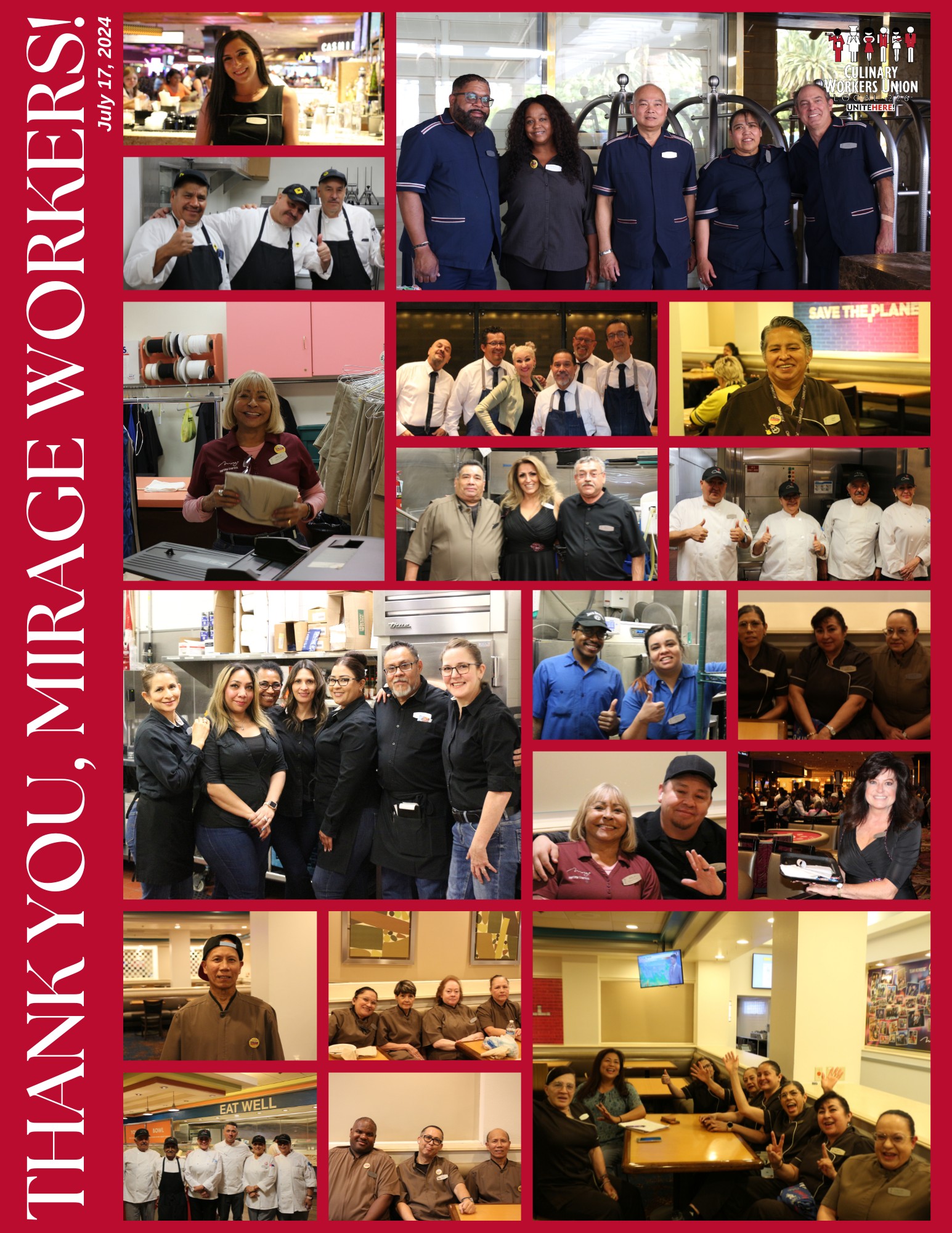 We want to take a moment to acknowledge and express our gratitude to all Mirage workers, especially the Day-1, 34-year Culinary and Bartenders Union members, and the countless shop stewards, volunteer organizers, committee, and captains at the Mirage over the last three decades who have been a part of our legacy of fighting and winning for working families.