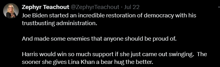 Welcome to You’re Probably Getting Screwed, a weekly newsletter and video series from J.D. Scholten and Justin Stofferahn about the Second Gilded Age and the ways economic concentration is putting politics and profits over working people. Welcome to You’re Probably Getting Screwed, a weekly newsletter and video series from J.D. Scholten and Justin Stofferahn about the Second Gilded Age and the ways economic concentration is putting politics and profits over working people. There has been a jolt of energy into the presidential race, but I’m not here to talk about coconut trees, brat summer or the K-Hive. Rather the energy I want to focus on is coming from Wall Street and Big Tech. Let’s start with CNBC’s Jim Kramer who on Monday voiced his belief that Vice President Kamala Harris, if elected president, will get rid of staunch antimonopolists like Federal Trade Commission Chair Lina Khan and Assistant Attorney General Jonathan Kanter. As JD pointed out several months ago, reinvigorating antimonopoly as a central component of economic policymaking will be one of President Biden’s most important legacies. In addition to smart personnel decisions like Khan, Kanter and Rohit Chopra at the Consumer Financial Protection Bureau, Biden’s executive order on competition has catalyzed other parts of the federal government, such as USDA and DOT, to fight corporate power. All told this work has started the process of unshackling us from our corporate masters and putting power back in the hands of workers, small businesses, farmers and families. How durable is this legacy? Unfortunately that could become a question. The predictions of a Wall Street mouthpiece like Kramer are one thing, but more concerning is the Silicon Valley donor class, and their supporters, that see Vice President Harris as a potential reset from Bidenomics. They are hoping for what they describe as a more centrist approach (see Matt Yglesias, megadonor Mark Pincus, entrepreneur Aaron Levie), but what that really means is a pro-monopoly platform that recommits to the past several decades of letting powerful corporations do whatever the hell they want. Just this morning, LinkedIn co-founder and billionaire megadonor Reid Hoffman told CNN he hopes a President Harris would fire Khan, who draws more scorn from monopolists than anyone else in the Administration. It is worth noting one of the arguments these folks are making is that the only supporters of the Biden Administration’s crackdown on corporate consolidation are lefty academics and policy wonks or as this Democrat Big Tech lobbyist said, Latte Liberals. There is nothing pro-business or pro-innovation about sucking up to monopolists though. Small businesses across this country in rural, urban and suburban communities from local grocers, independent pharmacies, neighborhood bookstores, family farmers and even tech startups are being crushed by monopolies. Will Silicon Valley billionaires get their way? Unlike Kramer, I’m not here to make any predictions. Frankly there were headlines about President Biden declaring he would be good for Big Tech back in 2020. The more important question to me right now is if this becomes an issue, who will notice? Part of the reason I do this newsletter is that while populist economics is having a moment it hasn’t had in generations, neither party has a monopoly on being antimonopolists yet. Work remains to make this a central part of policymaking, but another four years of Khan and Kanter would be a major step in that direction. In an election that will already feature plenty of faux-populism, the Vice President would do well to double-down on the actual work that is being done to crack down on corporate power and protect the economic freedom and liberty of everyday people. While talking about antitrust might make most people’s eyes glaze over, Americans of all stripes are increasingly concerned about the extreme power of corporations in our country and are looking for politicians that will do something about it. Of course this is also a good reminder that the president is just one of the offices on the ballot this year. Did you know that there are 10 state attorneys general races in 2024? Any of those races could have a huge impact on structuring a fairer economy. State legislators also play a key role in this work and thousands of them across the country will be on the ballot in November. A durable antimonopoly movement does not start in DC, it must begin in our communities and reach out to the halls of power. The coming months might provide an indication of where we are in building such a movement. YOU’RE PROBABLY (ALSO) GETTING SCREWED BY:John Deere In 2024, John Deere eliminated 1,473 manufacturing positions in mass layoffs at its facilities in Iowa. Meanwhile, John Deere CEO John May made $26,285,804 last year… Reminder, this report shows the Trump Tax cuts encourages companies to ship jobs overseas. Ag Monopolies Minimum Wage It’s been 15 years since the Federal Minimum Wage has been raised. Big Tech Why are we worried about Tech monopolies? CrowdStrike’s digital disaster where planes were grounded, hospitals were in disarray, and government services grinded to a halt is why. SOME GOOD NEWSNoncompetes Pennsylvania judge rules in favor of FTC’s Noncompetes Rule. Stock Ban in Congress The Senate Homeland Security and Governmental Affairs Committee approved compromise legislation to ban lawmakers from trading stock. FTC Continues to Look Out for Us NCAA Antitrust Settlement We’re eager to find out about the Antitrust Settlement with the NCAA. Shoutout to J.D.’s old law firm Hagens Berman on their leadership in this matter. BEFORE YOU GOBefore you go, I need two things from you: 1) if you like something, please share it on social media or the next time you have coffee with a friend. 2) Ideas, if you have any ideas for future newsletter content please comment below. Thank you. Break ‘Em Up, Justin Stofferahn 