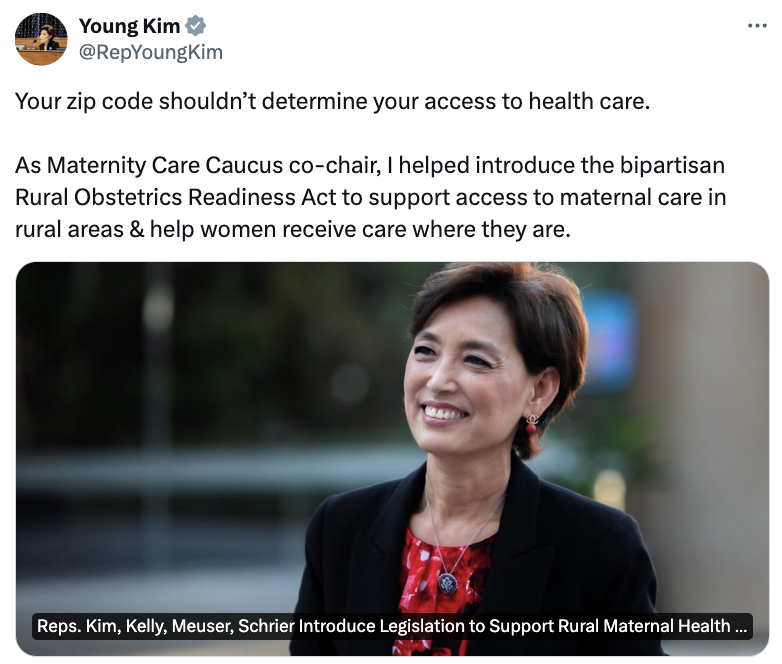 Many women in rural communities face additional obstacles when trying to receive maternal health care. Rep. Young Kim (CA-40) recently introduced legislation to support rural health care facilities so they can better serve the women who depend on them.