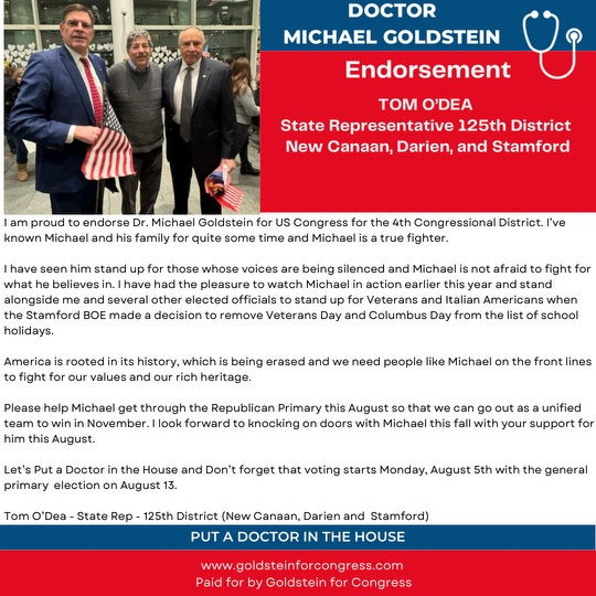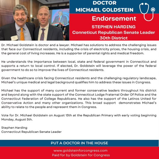 State Senate Republican Leader Stephen Harding along with Senator Tom O’Dea of New Canaan/Stamford have just endorsed Dr. Michael Goldstein.
