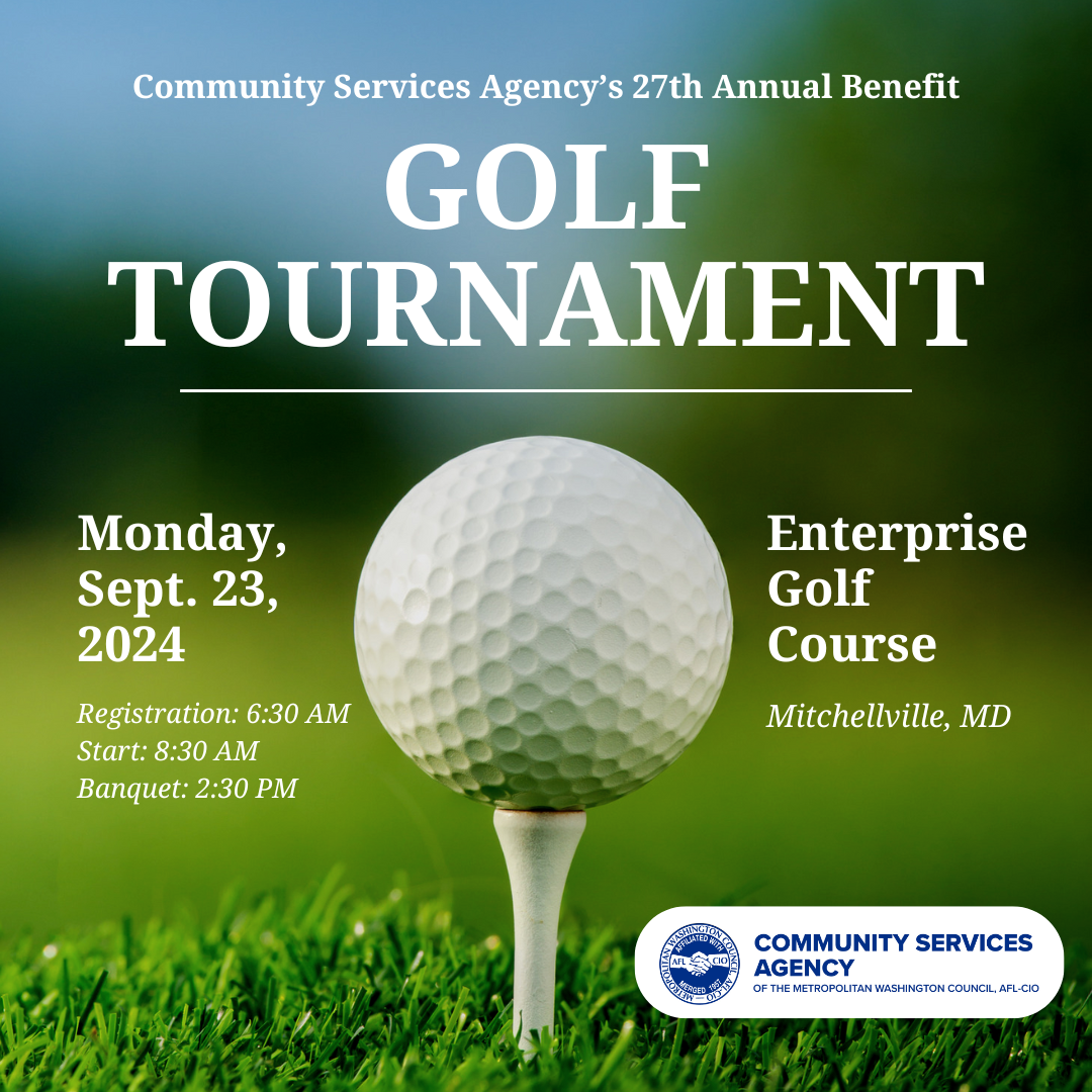 Community Services Agency 27th Annual Golf Tournament Monday, September 23 – 6:30 AM Enterprise Golf Course You are invited to join the Community Services Agency for their 27th Annual Golf Tournament, to benefit the emergency assistance fund for union members in need. This year’s event will take place on Monday, September 23 at Enterprise Golf Course in Mitchellville, MD. Register for this year's tournament.