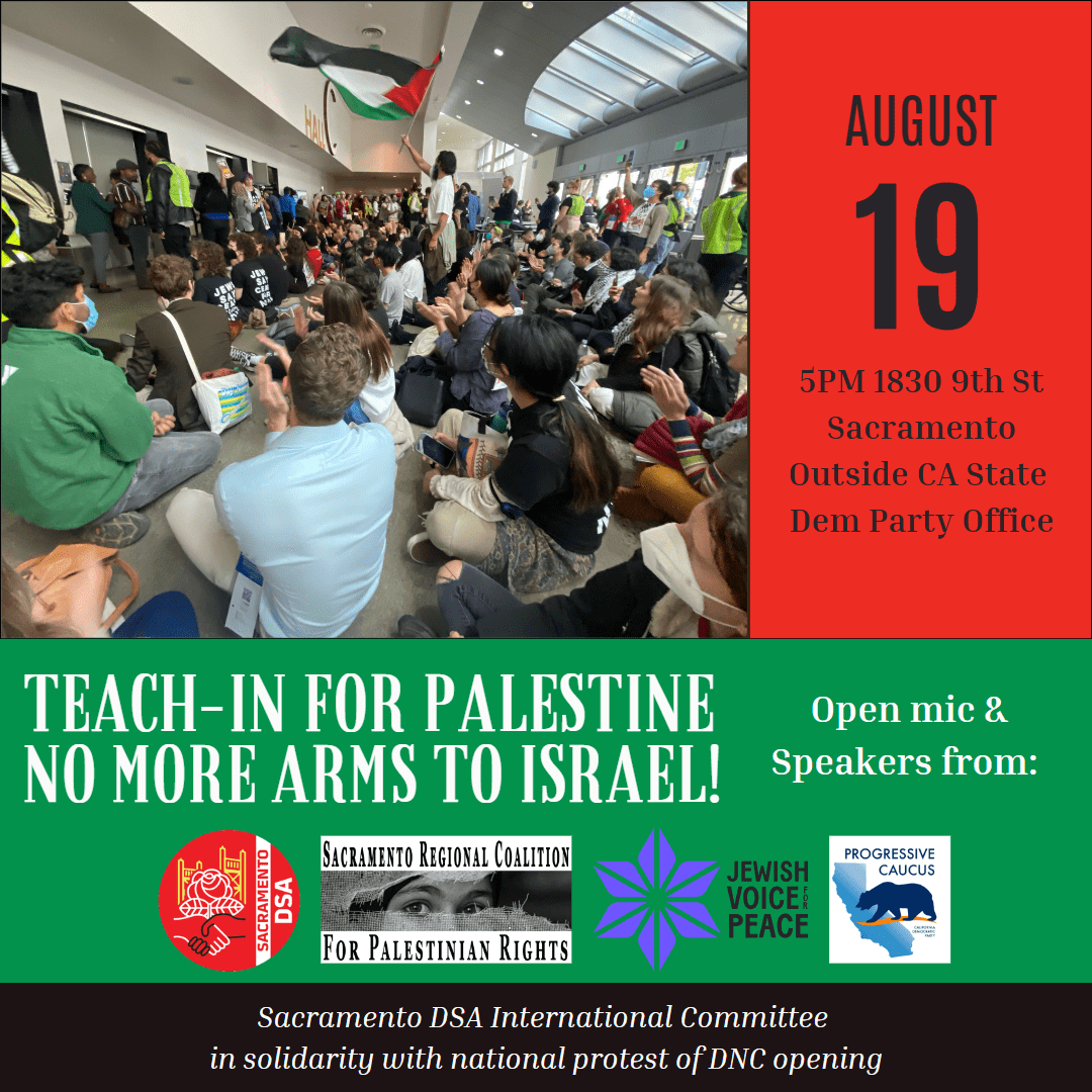 Sacramento DSA will be hosting a solidarity action to make clear that working-class people do not support our government's complicity with Israel's genocide in Gaza.