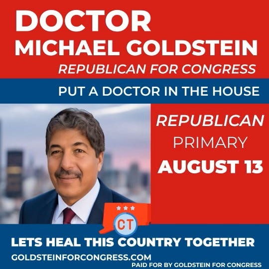 I strongly recommend that you cast your vote for Dr. Michael Goldstein as our candidate for the U.S. House. While it is without doubt an uphill battle to defeat Himes, if anyone can do it Michael can. He is a determined person and is both a physician and a lawyer. It takes a lot of discipline to do both. If elected he will bring common sense back to the House supporting individual freedoms and fiscal responsibility. And won’t it be nice to have a Doctor in the House. So please don’t forget to vote in the Republican Primary Tuesday August 13th. Polls are open from 6am to 8pm. You can also avail yourself of early voting anytime between 10am and 6pm today (Friday) or Saturday or Sunday at Town Hall. |