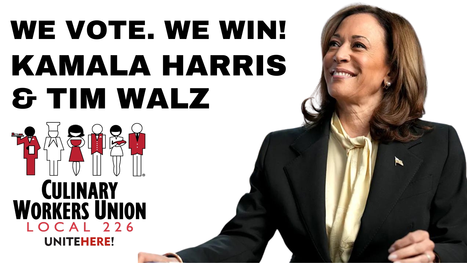 The Culinary Union is proud to endorse Kamala Harris for President and Tim Walz for Vice President of the United States of America.