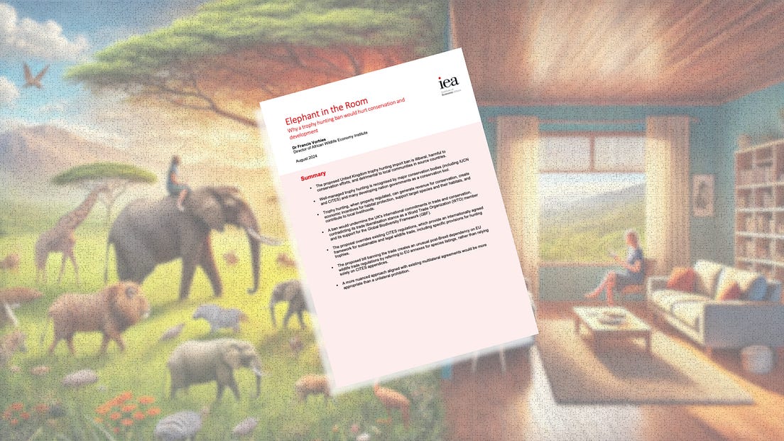 By John King, IEA Director of External Affairs As an intern at the IEA over a decade ago, I developed a deep fondness for the place. Of course, a fondness for the ideas we cultivate and espouse but also a fondness for the culture, a mission led family, a fantastic group of bright individuals who really want to change something. Some 12 years later, I can’t say much has changed on that front. The vibrancy of that family remains. Much has changed on how we deliver our work though. There have been leaps forward in the Education team’s approach, for example, especially around value delivery to the young people we engage. The International team’s work means we are a truly global think tank and unique in this country for the sheer breadth and scope of that work. Many would argue we communicate via YouTube, Substack and social media even more effectively than in the traditional press, allowing our world class research to reach many more receptive minds. Although some years have passed since my time at the IEA, the ideas I learnt here have stayed with me, the want to change things has stayed with me. Overall, the decision to come back was based on a want to give back, to take skills honed in other places and bring them to bear effectively here. Many of us have worked at a think tank, campaign organisation or have been closely aligned to the same in our youth but so many see that time as a moment in their lives, albeit a fond one. I charge anyone who has worked in the furnace of ideas to consider giving some of their time back to the places that helped shape their young mind. Of course, not everyone can make a career move but most can volunteer some time and offer their talent for the betterment of places like the IEA. Some of us have jobs that are far too onerous to give time — I know I did — but where we can’t give time we can give financially, to help the next generation of minds and to help steer our country to a better place. Similarly, we can assess where there may be scope for the companies we work at in the private sector to support the work of the free market movement by donating to forward research in areas of mutual interest. A good first step for IEA alumni would be to attend our alumni gathering next week or just get in touch, we always welcome old friends. P.S. The best way to support our vital research and educational programmes is to become a paid IEA Insider. For a limited time, new paid subscribers will receive a copy of Steve Davies’ new book Apocalypse Next: The Economics of Global Catastrophic Risks) and a 15% discount. Elephant in the Room: Why a trophy hunting ban would hurt conservation and developmentAfrican leaders, including the President of Botswana, have argued that the proposal is colonialist. By conservation economist Dr Francis Vorhies