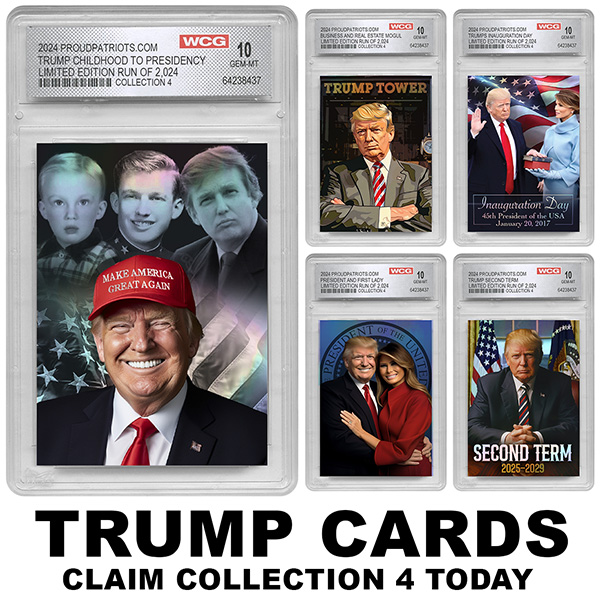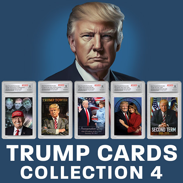 Limited Print Run of only 2024 available for sale. Collection #4 is comprised of 5 newly designed, highly collectible Physical Trump Trading Cards!