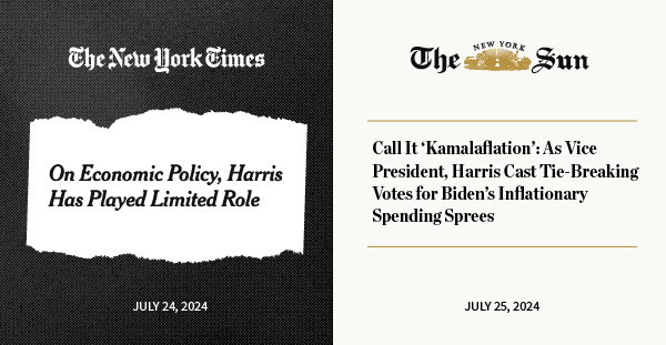 The screenshot on the left, from last month, shows how the Times covered the story of Kamala Harris’s economic policies. The Times would have you believe that she bears no responsibility for the failures of the Biden administration in which she serves. The Sun, as you can see below, wants you to know the truth. Nothing more. Nothing less. |