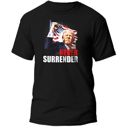 Show your undying support and grab your "NEVER SURRENDER" Trump T-shirts to support the Trump 2024 campaign.
