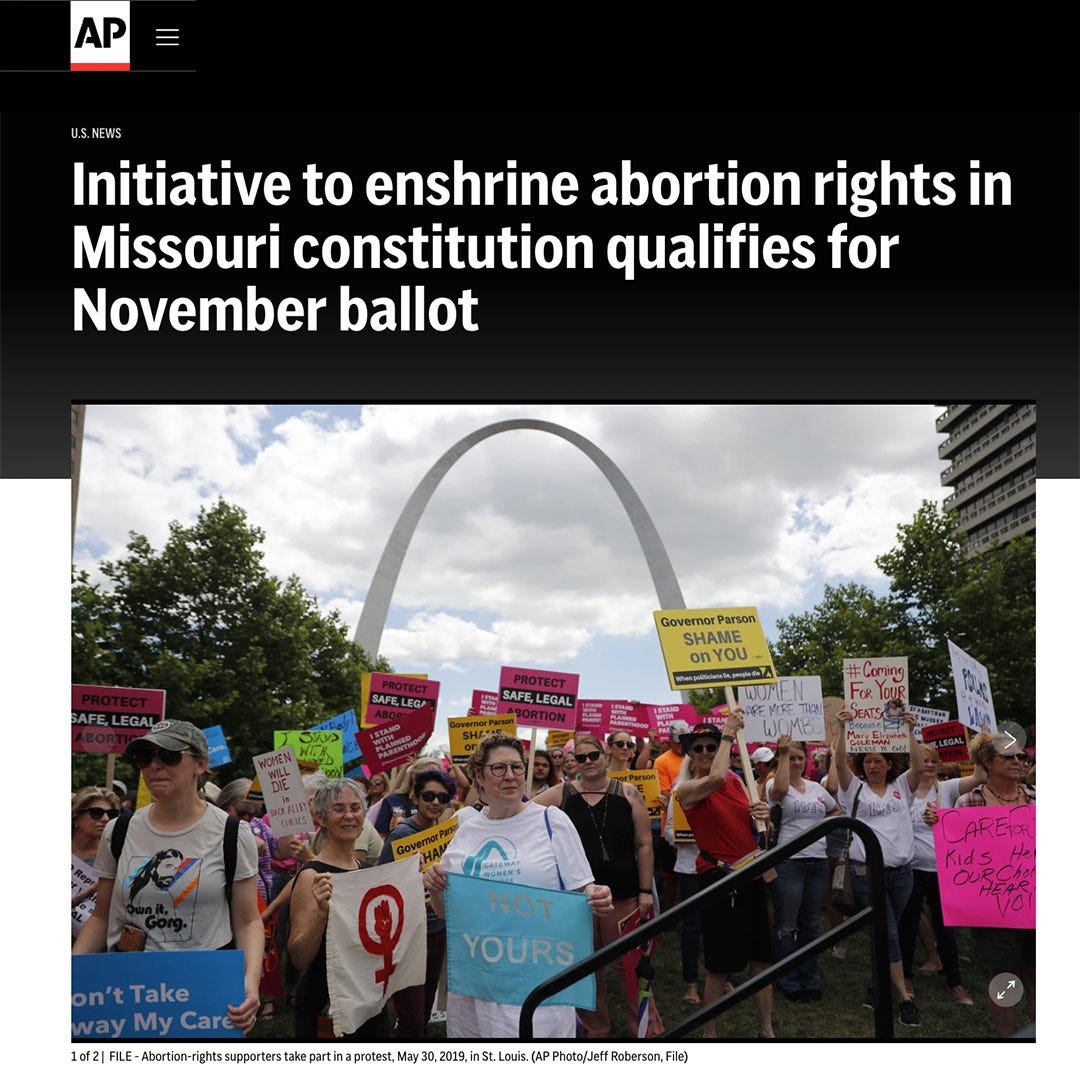 Breaking: Abortion is officially on the ballot in NovemberMissouri’s ban and Hawley’s crusade for a national ban end hereThe AP reports enough signatures have been counted that Missouri voters will be voting to enshrine the right to an abortion this November. Missouri voters have long taken their freedom back at the ballot box. Missouri voters rejected anti-union right to work laws – even when Hawley supported them. Missouri voters expanded Medicaid. Missouri voters raised the minimum wage $5 over the federal minimum wage. Missouri voters legalized weed. Now, it's official. This November, Missouri voters have a chance to take their freedom back once again — to end Missouri’s abortion ban AND to end Josh Hawley's crusade to ban abortion nationwide. We have the momentum in this race and we need your help to capitalize on it. Help us drive this home. |
