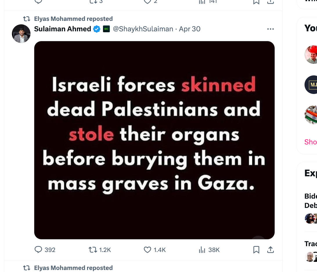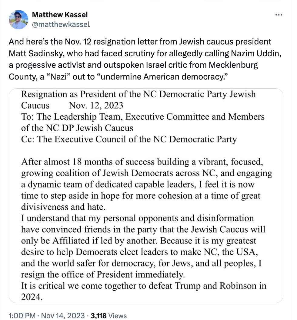 The NC Jewish leaders warned that such stances could fuel antisemitism and ignore Israel's security concerns. The North Carolina Coalition for Israel echoed these concerns, accusing the NC Democrats of perpetuating antisemitic stereotypes and calling for the resolutions to be rescinded. This year, the NC Democratic Party's executive committee voted against recognizing the state’s Democratic Jewish Caucus, with 16 key members abstaining, including the state party chair Anderson Clayton. Jewish Caucus leaders called the rejection “a shocking defeat,” accusing the meeting of being "hijacked by the anti-Jewish left." The decision, rooted in internal divisions over Israel following the Oct. 7 Hamas attack, has sparked harsh criticism. As crucial elections approach, many Jewish Democrats see the party as being tainted with antisemitism. After public pressure, the NC Democratic Party finally relented and allowed a Jewish Caucus to form. Anti-Semitic rhetoric and actions from within the party's leadership should alarm every voter. This isn't just about political differences; it's about our state's moral compass. The Case of Elyas MohammedThe North Carolina Democratic Party has multiple leaders who hold and espouse anti-Jewish hostilities. Elyas Mohammed holds positions that influence policies and direction, not just as a member but as a critical leader. Here's what you need to know: Leadership Role: He's on the executive committee and chairs the Muslim Caucus, positions that give him significant sway over party affairs. Anti-Semitic Rhetoric: Mohammed has been leading protests against Jewish communities in North Carolina, calling Jewish people "child killers." This is not just offensive; it is a direct incitement to hatred. This isn't just offensive; it's a direct incitement to hatred. Blood Libel: He propagates blood libel conspiracies, an age-old anti-Semitic trope, which falsely accuses Jews of ritual murder. This kind of misinformation is not just historically inaccurate but dangerously inflammatory. Exclusion of Jews: The NC Democratic Party's Faith Caucus, under Mohammed's influence, seems to systematically exclude Jewish representation, a clear sign of where the party’s priorities lie. False Accusations Against Israel: Mohammed continuously accuses Israel of war crimes, a narrative that ignores the complexity of the region's conflicts, where Israel's actions are often in self-defense against terrorism. This isn't just a Democratic Party issue; it's a national security and moral issue. The NC Democratic Party's direction under figures like Mohammed undermines this support, promoting a narrative that could lead to the isolation of Israel on the global stage. Such rhetoric within a major political party in the U.S. signals a growing acceptance of anti-Semitism, a concern for all Americans, Democrats and Republicans alike. For pro-Israel Republicans, this moment demands action: Engagement: Engage with your representatives. Demand that they address these issues across the political spectrum. Support Pro-Israel Candidates: In elections, support candidates who unequivocally stand against anti-Semitism and for Israel's right to exist and defend itself. Unity: Work towards bipartisan efforts where possible. Anti-Semitism should not be a partisan issue but a human rights issue. The presence of figures like Elyas Mohammed in influential positions within the NC Democratic Party is not just a threat to Jewish communities but to the values of freedom, security, and peace that America stands for. It's time for Republicans, especially those who support Israel, to stand firm, speak out, and act against this rising tide of anti-Semitism. Let's ensure that our political landscape remains one where hate has no home. You're currently a free subscriber to NC Political Tea. For the full experience, upgrade your subscription. |