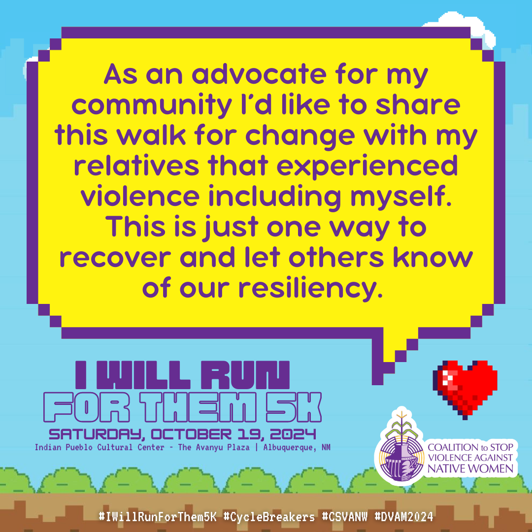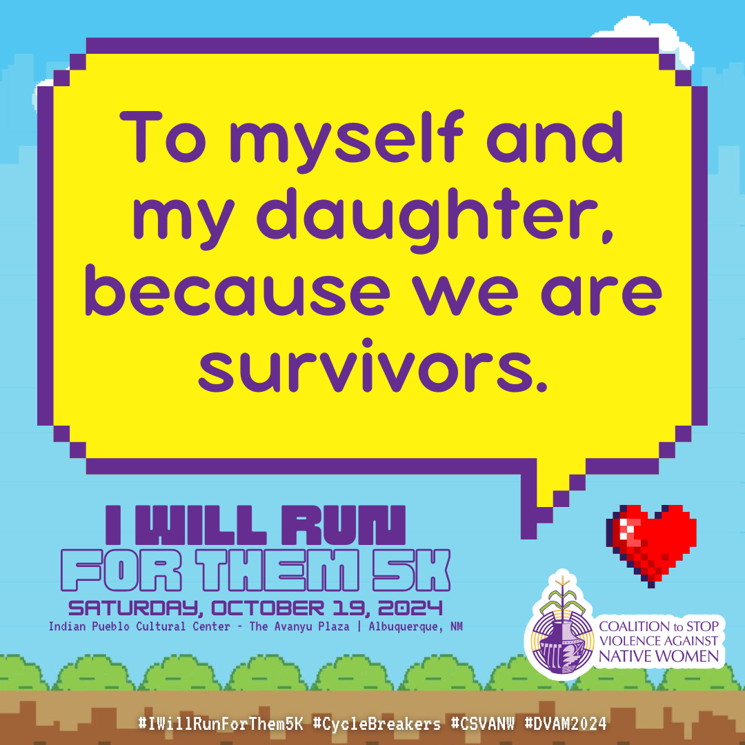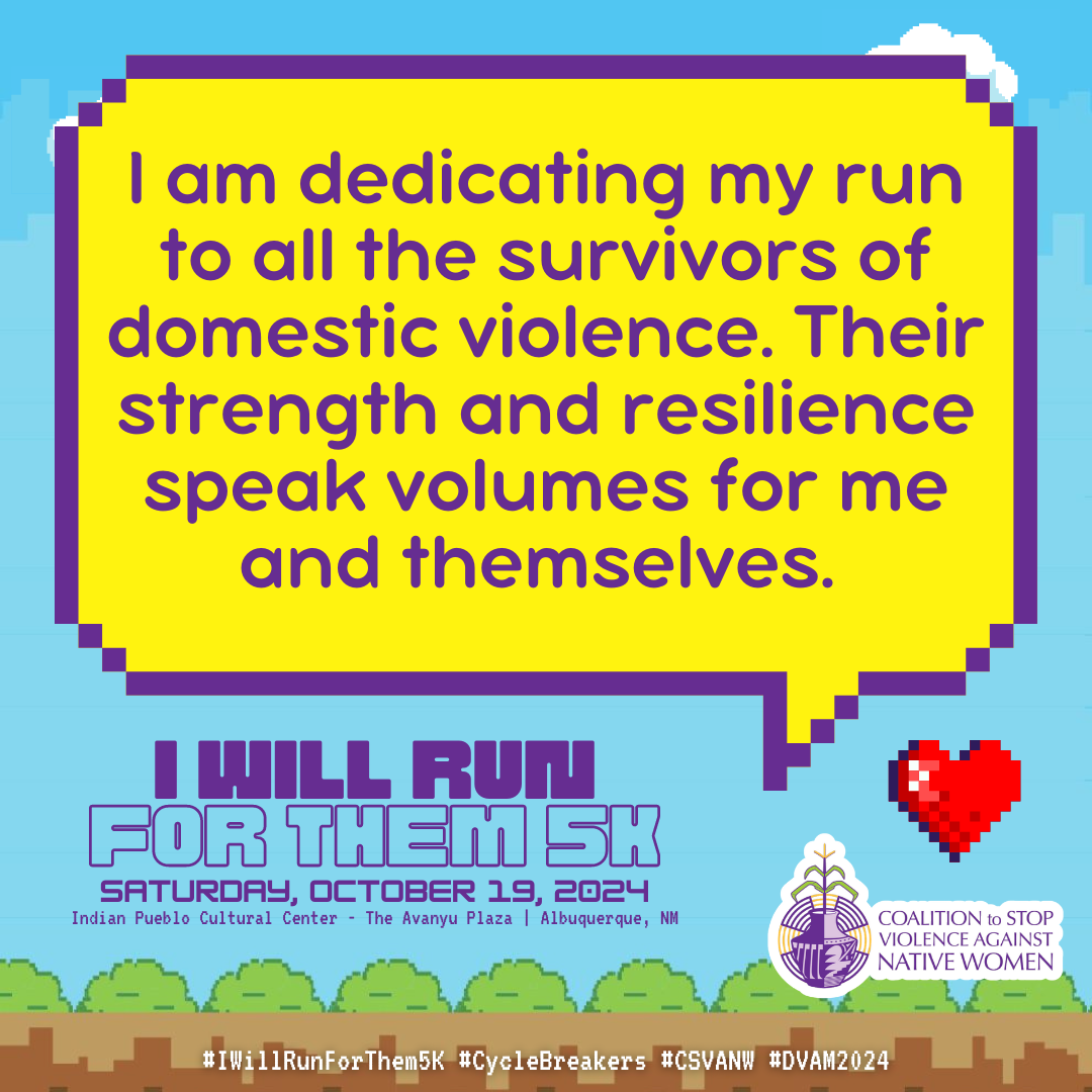 October is Domestic Violence Awareness Month (DVAM) and our annual I Will Run for Them 5K awareness run & walk honors the resilience, strength and spirit of our Native relatives impacted by domestic violence.