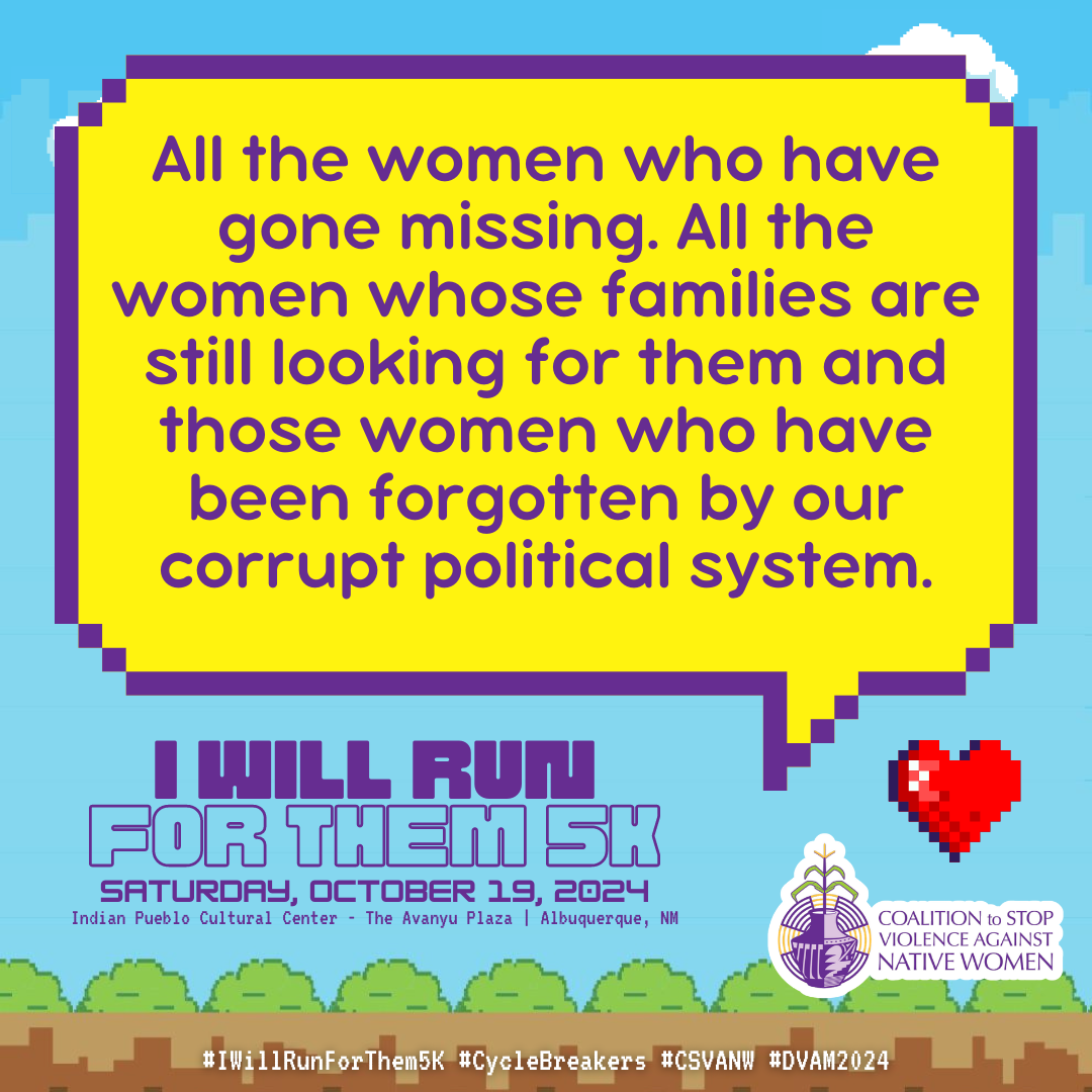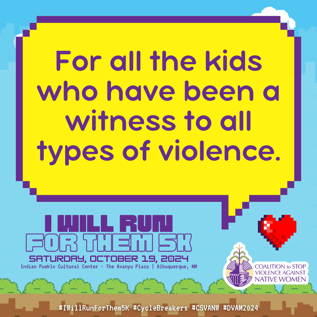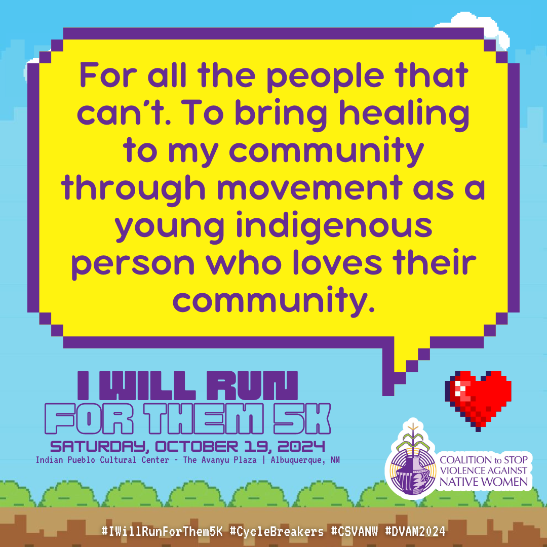 October is Domestic Violence Awareness Month (DVAM) and our annual I Will Run for Them 5K awareness run & walk honors the resilience, strength and spirit of our Native relatives impacted by domestic violence.