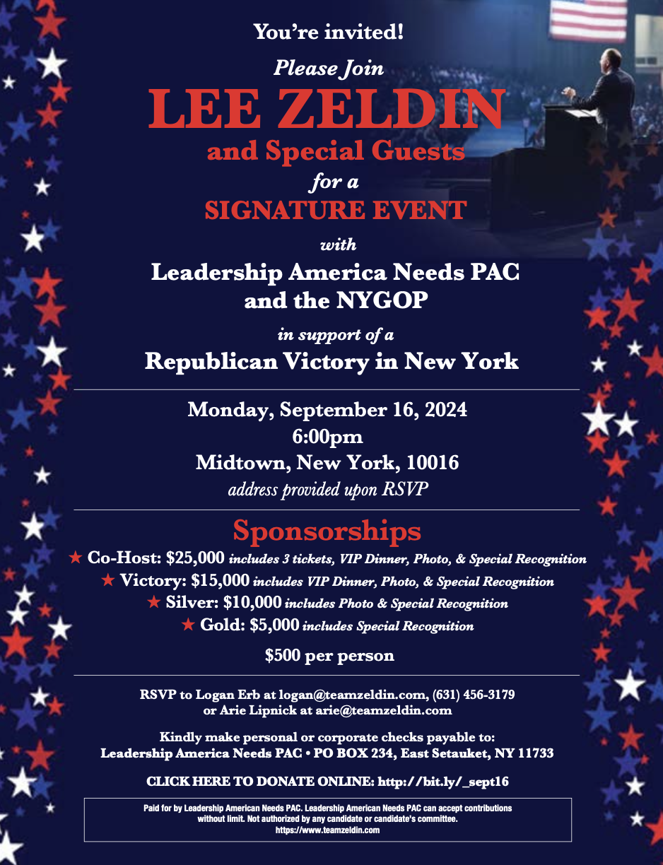 I hope you can join me for my Leadership PAC’s signature fall event in New York City next month. We have been working as hard as we can to continue the red wave we started in New York in 2022, but we need YOUR help. That’s why I am asking you to please join me in Midtown Manhattan on September 16th. There will be special guests, food, drink, and plenty of opportunity to discuss critical efforts for this year’s election.