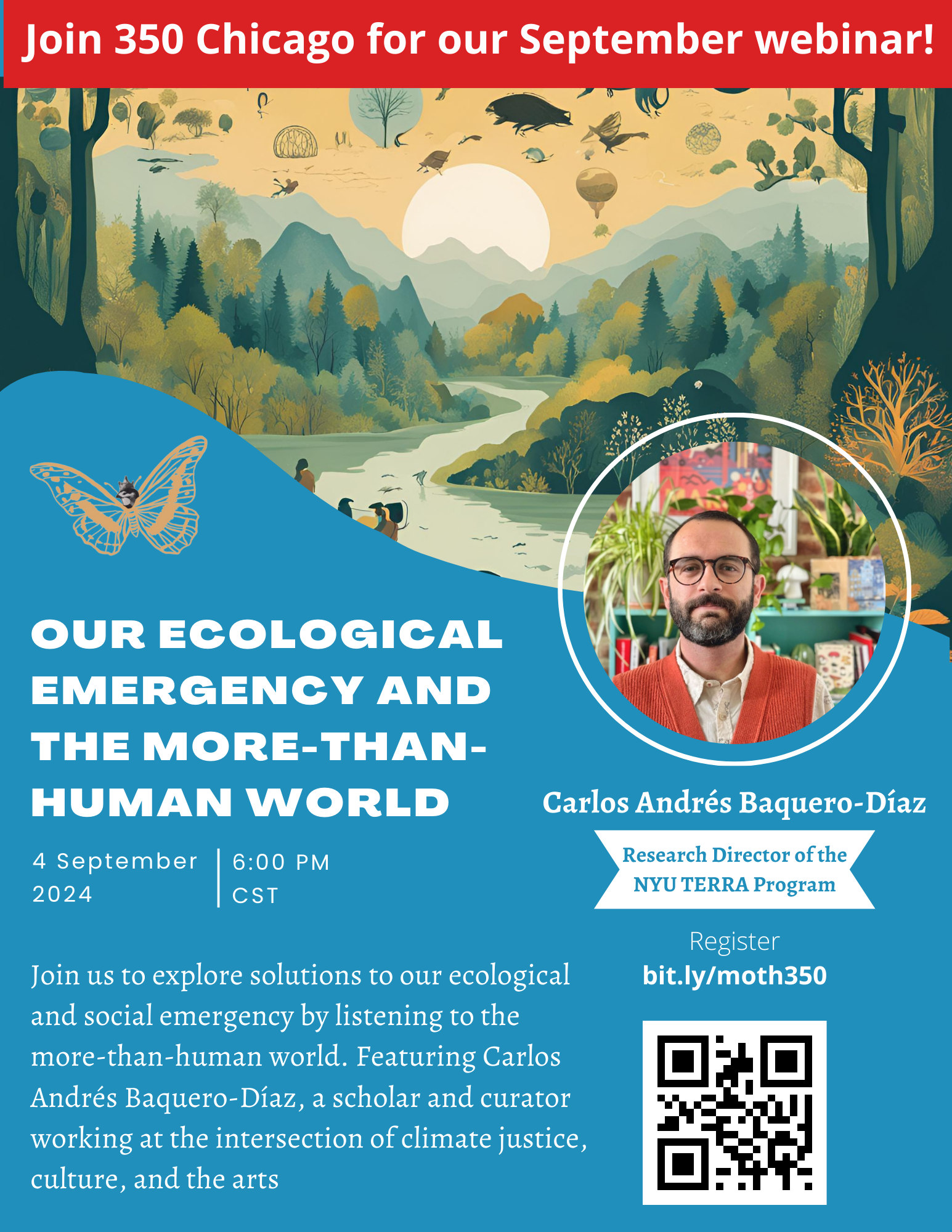 We have a quick turnaround between 350 Chicago Speaker events, so I wanted to let you know as soon as I can about our next speaker, Carlos Andr?s Baquero-D?az, who will be giving a webinar for us on Wed. 9/4, 5pm CT, 6:00 ET.