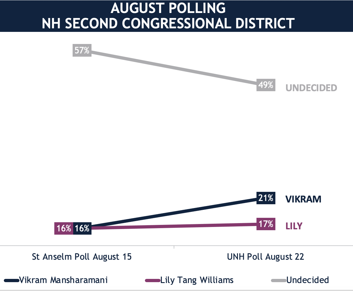 The UNH poll was just released and it shows that Vikram has moved into first place! Last week the Saint Anselm poll had the race tied, so it is clear that Vikram has the momentum.