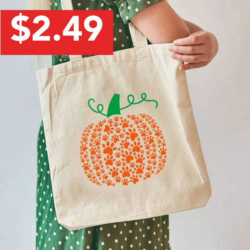 So, we’ve marked down our NEW Pumpkin Paw Tote to just $2.49.