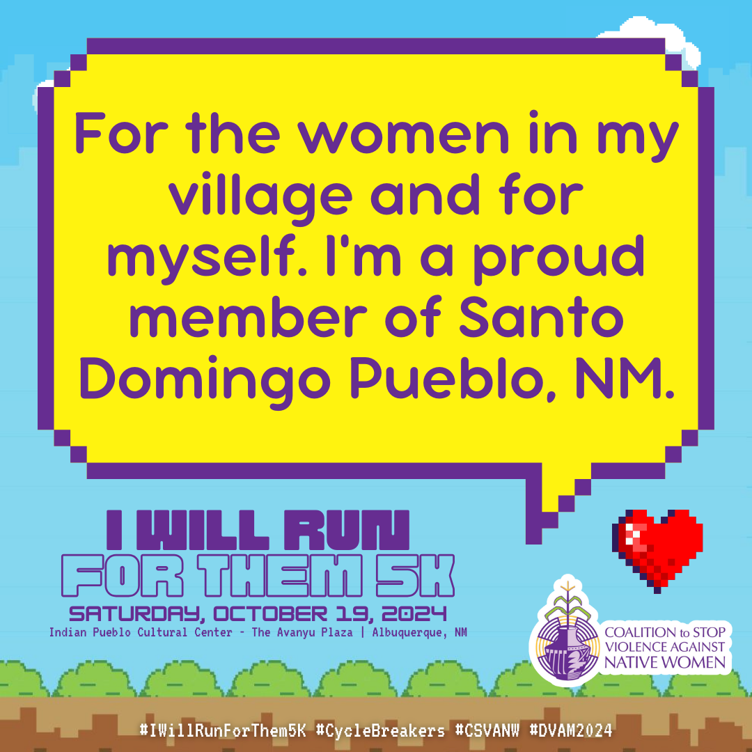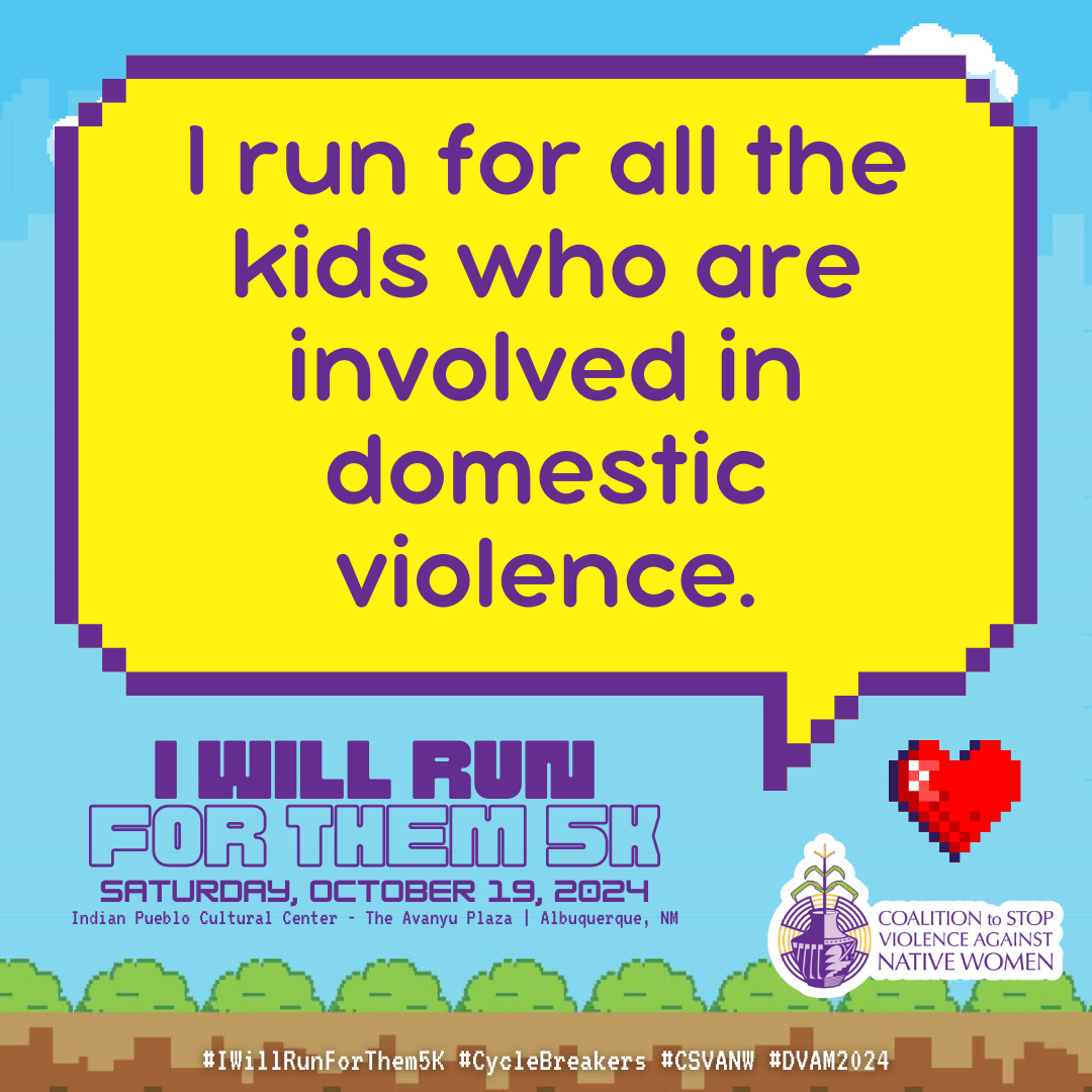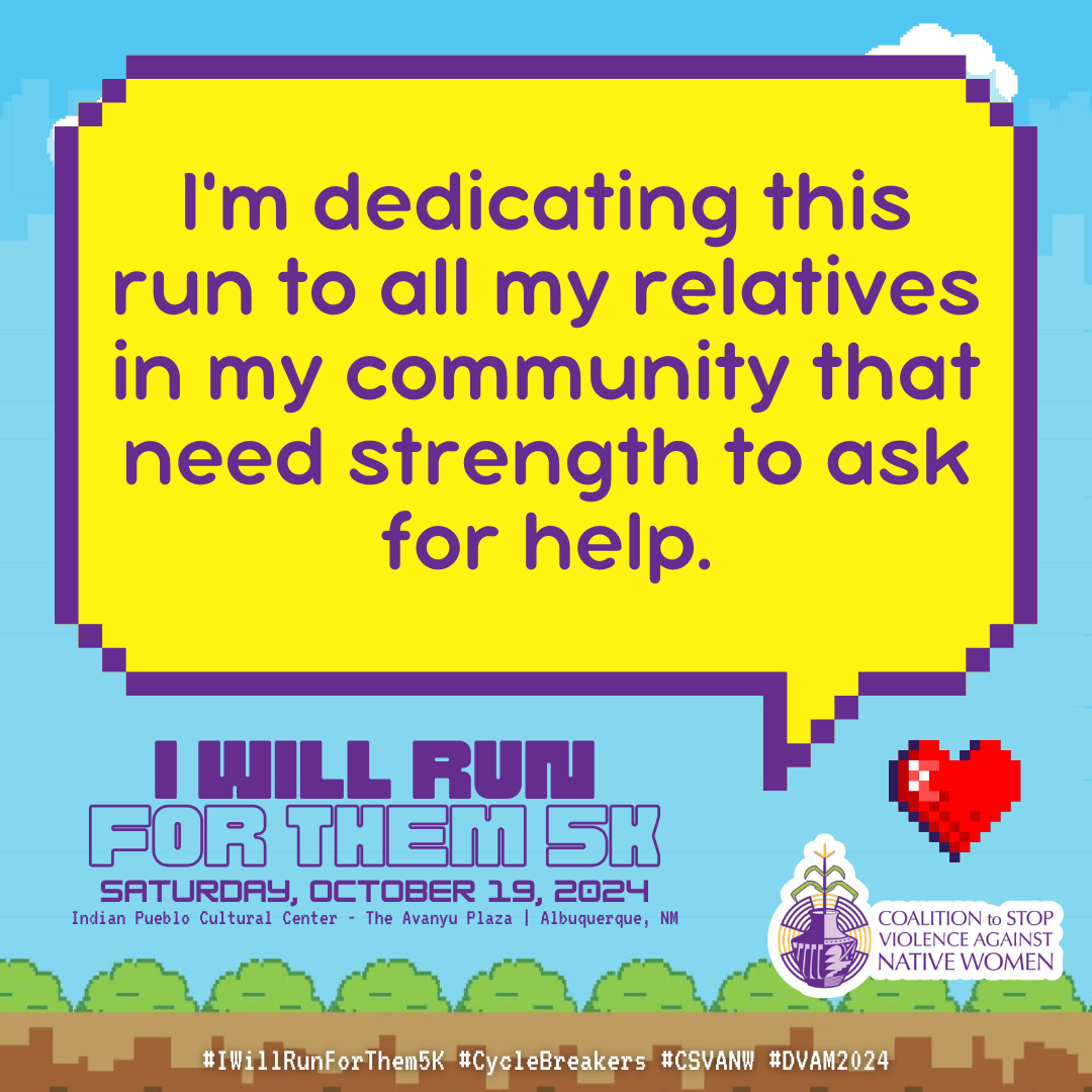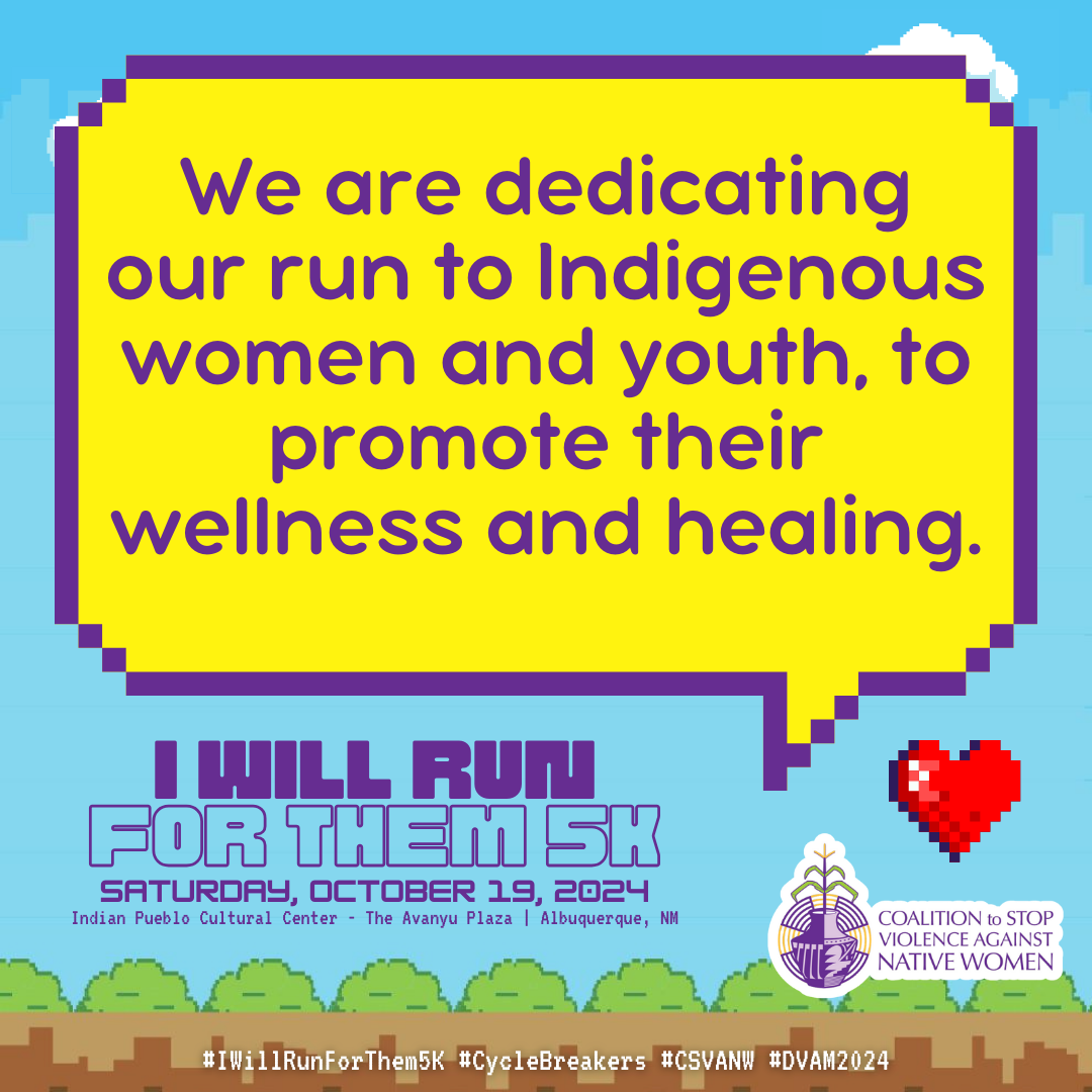 October is Domestic Violence Awareness Month (DVAM) and our annual I Will Run for Them 5K awareness run & walk honors the resilience, strength and spirit of our Native relatives impacted by domestic violence.