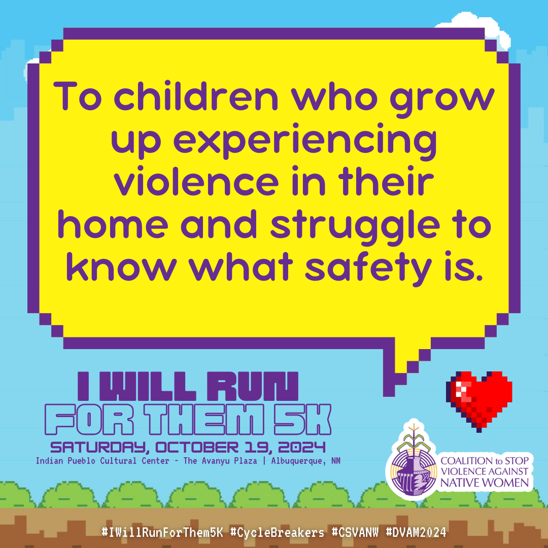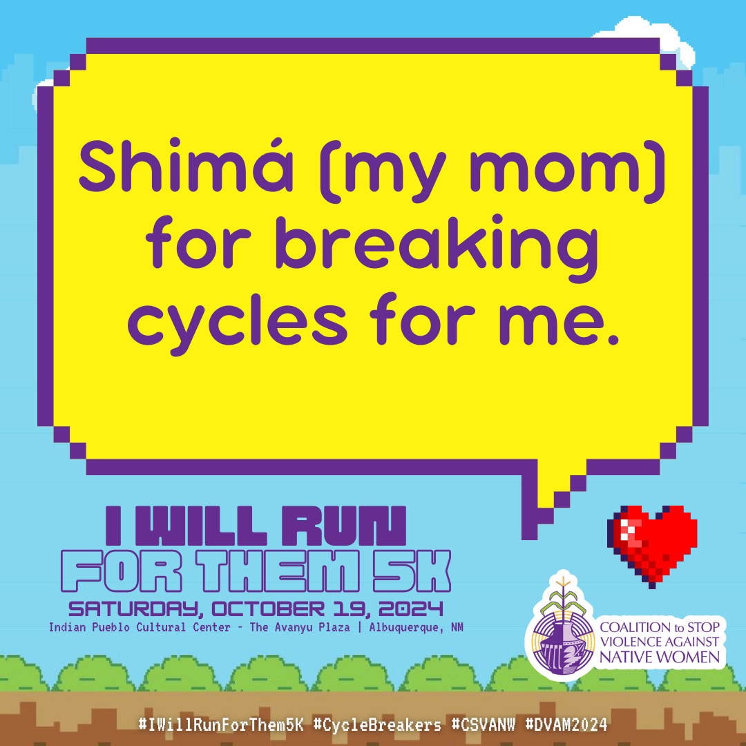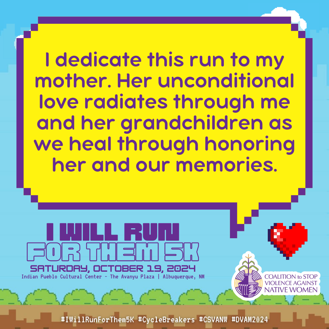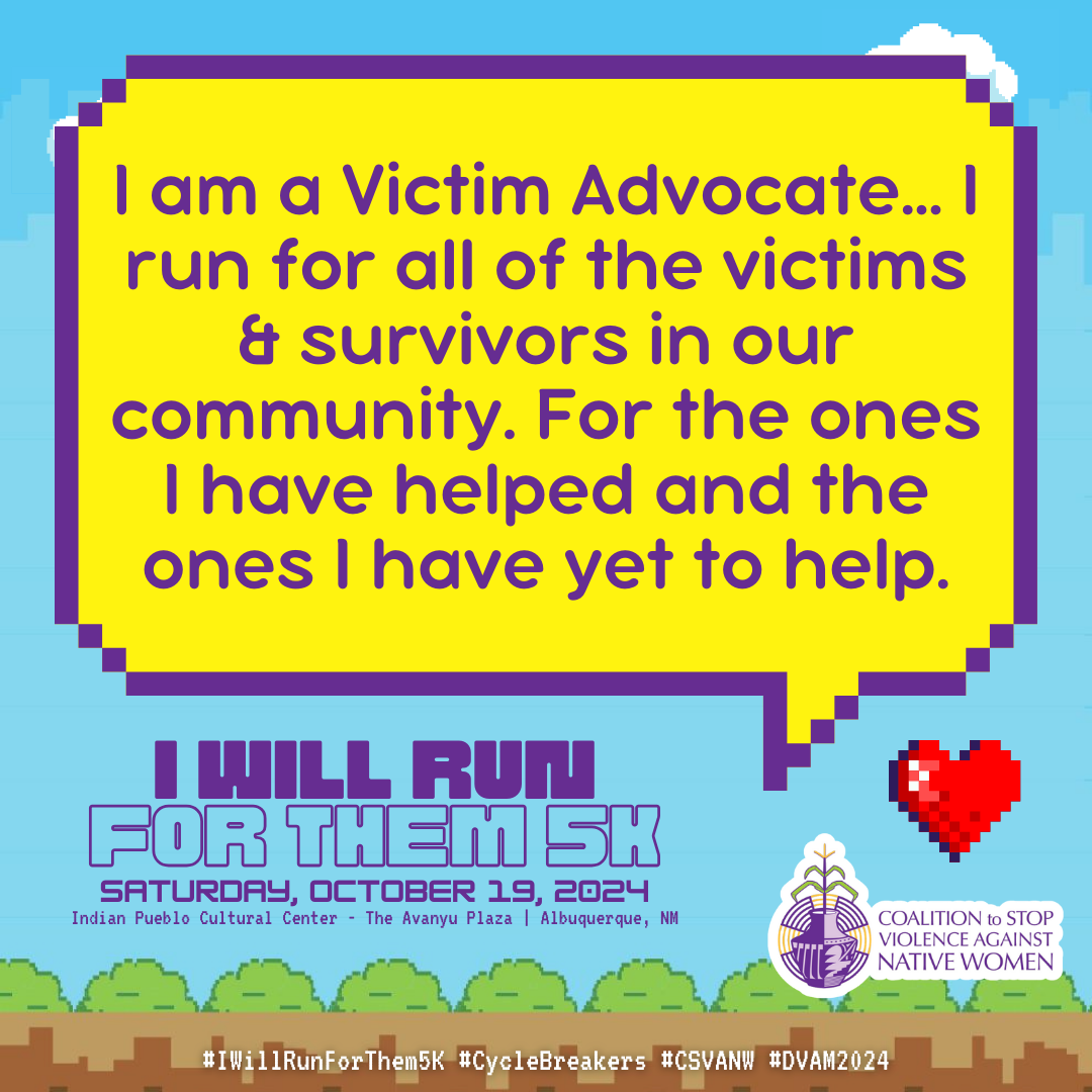 October is Domestic Violence Awareness Month (DVAM) and our annual I Will Run for Them 5K awareness run & walk honors the resilience, strength and spirit of our Native relatives impacted by domestic violence.