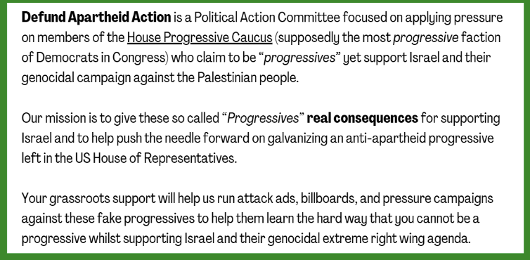 Our organization’s goal is simple: While we can’t go on the offensive against every pro-Israel Democrat in Congress, we can make a real impact by going on the attack against so-called “Progressive Democrats” in ep blue districts whose constituents have no idea that their supposedly progressive representatives are foaming at the mouth in support of Israel.