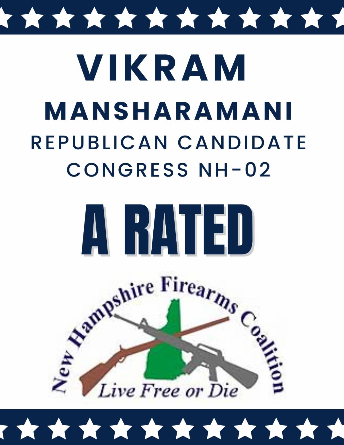 We were thrilled to learn that the NH Firearms Coalition, New Hampshire's premier Second Amendment organization, awarded Vikram an "A" for his positions on Second Amendment issues!