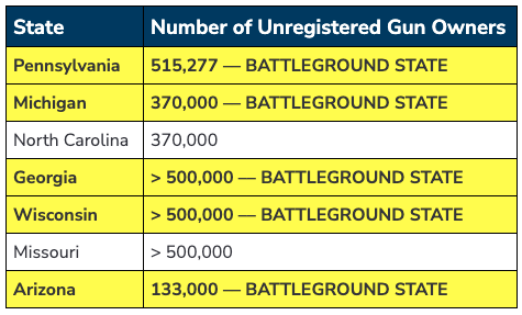 John, 10 MILLION gun owners are unregistered to vote. But what’s even more concerning is the states that will decide this election – and the future of our country – is where a large portion of unregistered gun owners reside. |