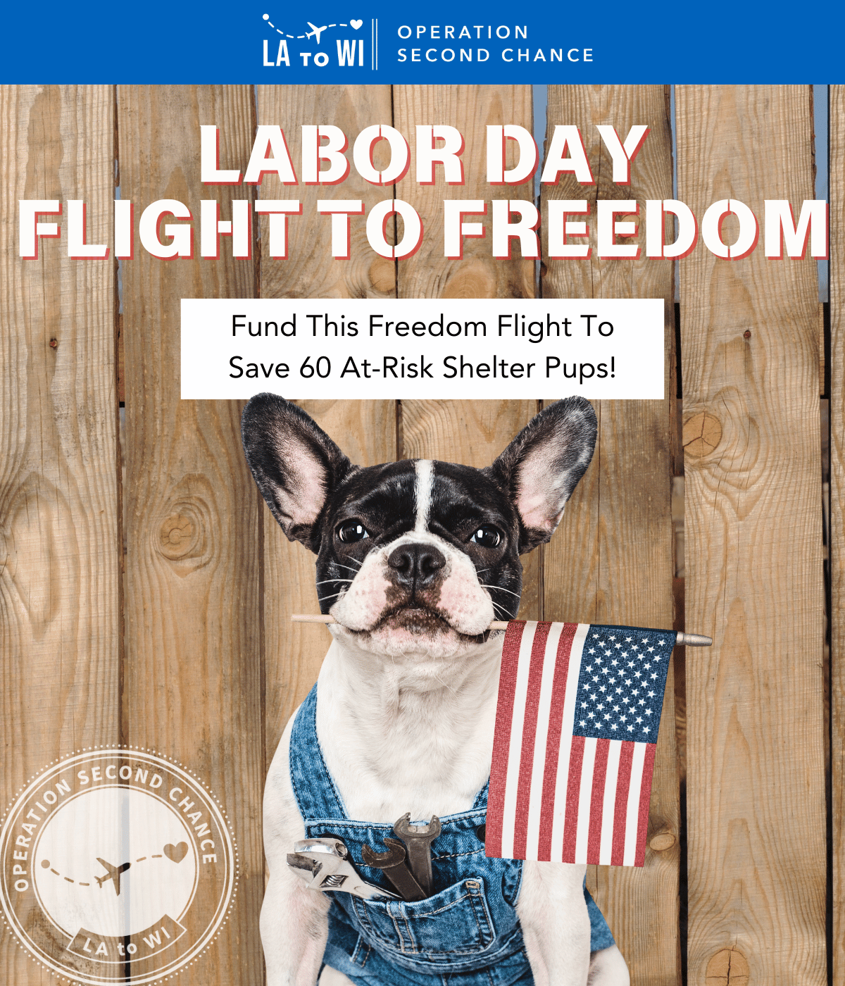 You’ve already helped us raise a third of the funds needed to fly 60+ at-risk dogs from cramped shelters in Louisiana to welcoming shelters in Wisconsin.