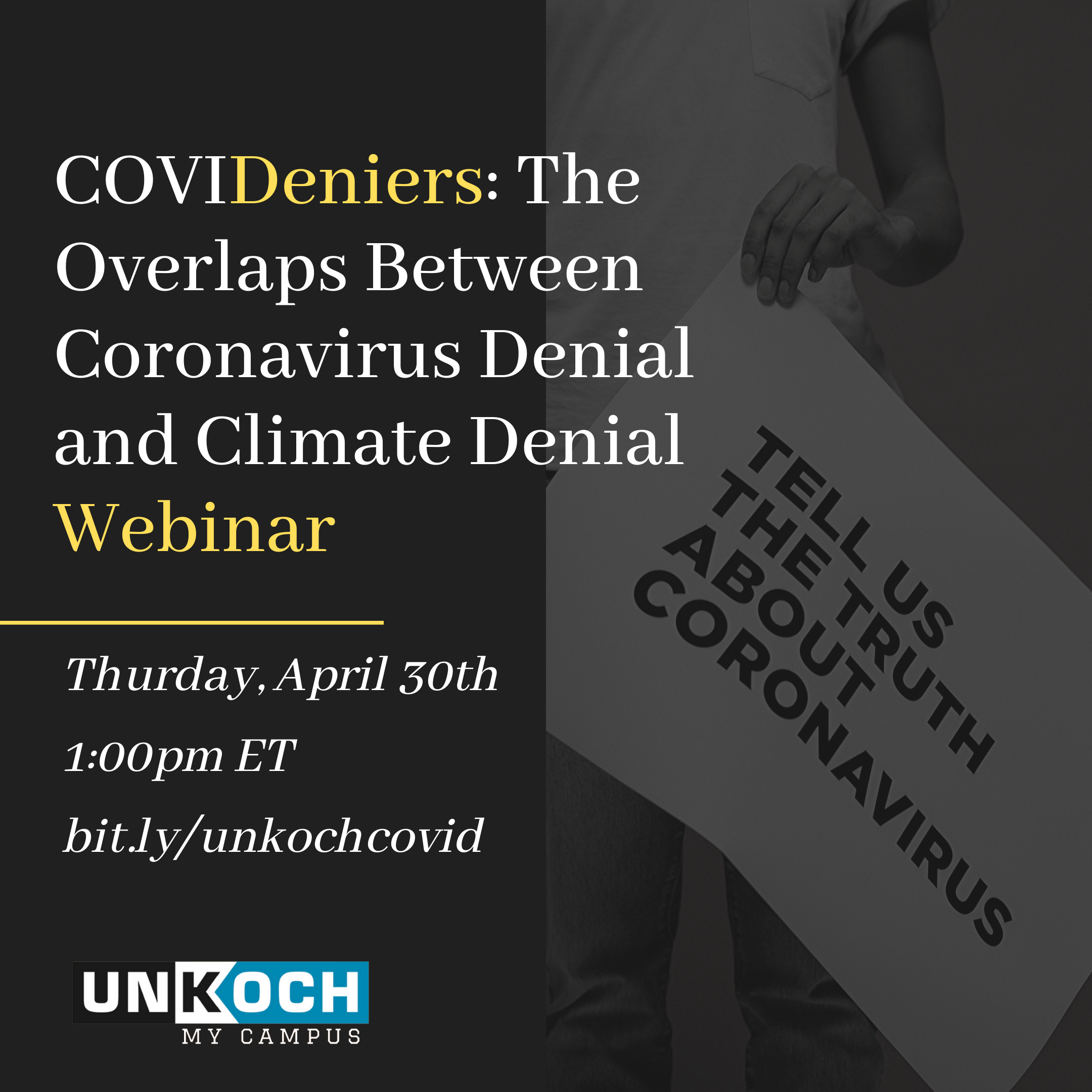 Dear friend, It is NOT too late to register for our webinar today (Thursday)! At 1:00pm ET we will be meeting together on Zoom to learn about COVIDeniers: The Overlaps Between Coronavirus Denial and Climate Denial. There's more information about our webinar below. Register Now! -------------------------------------------------------------------------------------------------------------------------------------------------------------------- The Koch Network’s targeted strategy to place profits over the lives of our community is working. We’ve seen it happen for decades with climate denial, and now we are witnessing it with the spread of anti-science coronavirus denial and protests to reopen the economy. The purposeful spread of misinformation is coming at a heavy price– our safety– and we must act now to disrupt it. Join us for our upcoming webinar this Thursday (April 30th) as we discuss the overlaps between coronavirus deniers and climate deniers. This webinar will cover: - Who is behind the "reopen" protests?