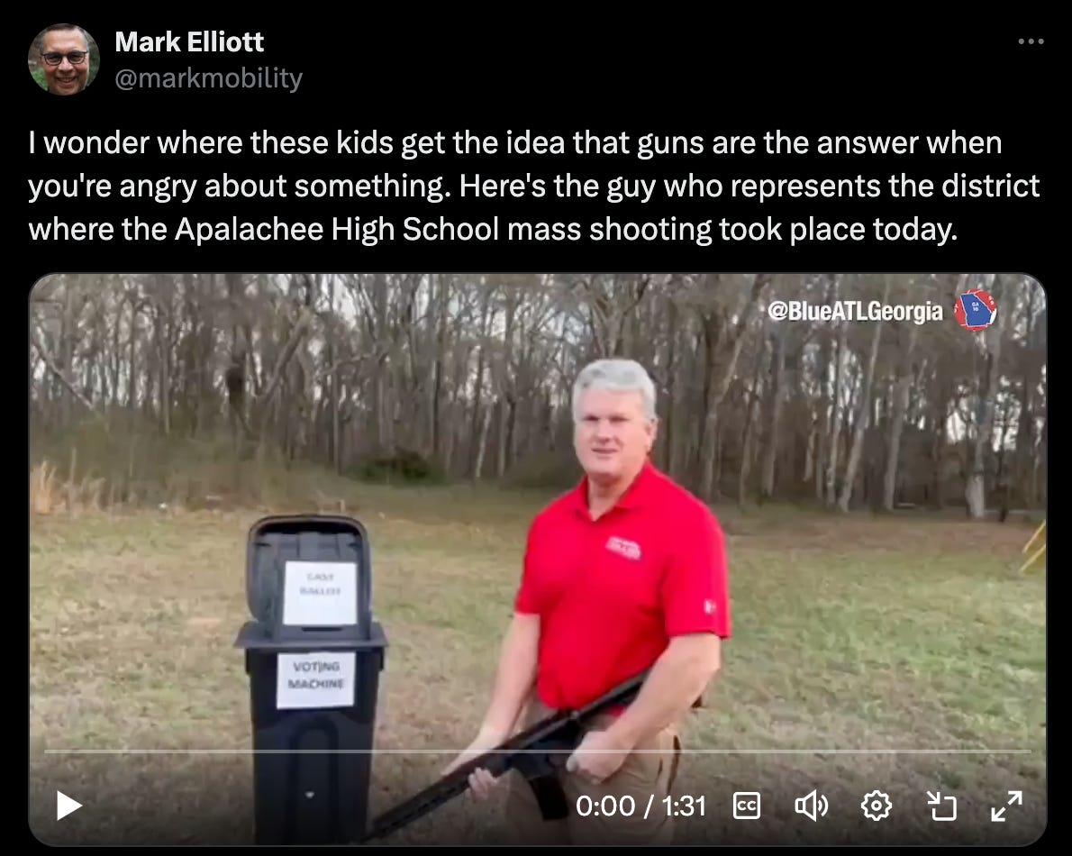 In anticipation of the inevitable ludicrous arguments, weird justifications, and defensive push-back I presume will be forthcoming from right-wing extremists as the nation once again—for the twenty-third school shooting this year—goes through all-too familiar motions of mourning the needless loss of lives and livelihoods, while demanding that we do something about it, it seems like a good moment to get clear-eyed about our Second Amendment. On my YouTube Channel, the series “Class with Jamie Raskin” is focused on debunking right-wing constitutional fallacies. This episode addresses the Second Amendment and the many ways it has been exploited, misunderstood, and manipulated, to the peril of the nation and the sacrifice of too many innocent individuals. Congressman Raskin is among the country’s strongest voices for using factual information to combat disinformation, especially when it comes to the Constitution. His entire Class is well worth a watch, but a few points are, sadly, especially pertinent today. The United States has the highest rate of gun violence in the industrialized world, and is the leading cause of death for children and young people under age eighteen. It doesn’t have to be this way. The Second Amendment has been woefully misinterpreted, with MAGA members of our own government using it to justify opposition to sensical gun control measures. Extremist Republicans with no idea what is contained within our Constitution like to argue that the Second Amendment prevents them from taking action, which is patently false. Democrats have aggressively advocated for measures like universal background checks, closing loopholes such as buying guns on the internet, and banning military-style assault weapons. Legislatively, we have the power to pass such laws. Which is what the vast majority of Americans would favor. Even our wobbly Supreme Court has never struck down background checks or bans on assault weapons. And yet, the GOP refuses to address gun violence effectively or to accept these measures when they’re presented to them (even after there was an assassination attempt on their nominee by using one such weapon). They resort to “thoughts and prayers” after mass shootings, without ever showing a willingness to take substantive action. It is a crisis. Modern Republicans have sought to blame gun violence on video games, on the shooter’s mental health, the degradation of the nuclear family, and even the number of doors in buildings. They’ve shifted blame to irrelevant factors like the Supreme Court’s decision on school prayer. Though I hesitate to join in their blame game, I do think it’s worth noting that this district’s very own Representative, Mike Collins, put out this…demonstration, which involves him walking toward the camera, stating that if Joe Biden wasn’t going to fix the 2020 election and get rid of voting machines, he would. He then turns toward the garbage bin labeled with a homemade sign that reads “Voting Machine,” raises his gun, and blows it up with enough fire power that you would think he was in possession of a canon. Second Amendment rights are secure in the U.S. We have more guns than any other country in the world. Reasonable gun safety measures can be enacted without infringing on these rights. And there is no need for weapons of war to be in the hands of everyday civilians, let alone teenagers. As Senator Reverend Raphael Warnock stated: “The entire Winder community is in my prayers, but we can’t pray only with our lips—we must pray by taking action.” Let’s pray at the ballot box. It doesn’t have to be this way. You're currently a free subscriber to Brian Tyler Cohen. For the full experience, upgrade your subscription. |