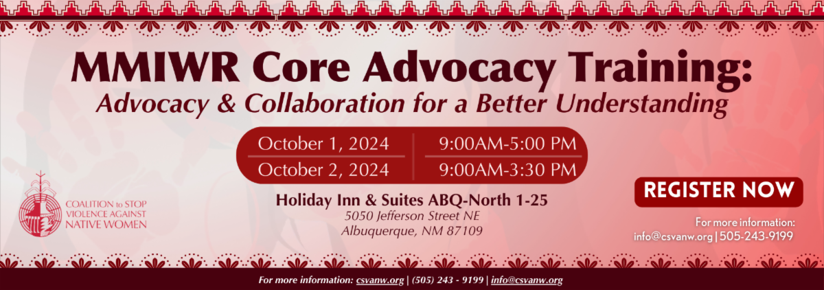 Join CSVANW for a two-day, in-person training that aims to provide participants with an understanding of the Missing and Murdered Indigenous Women and Relatives (MMIWR) crisis. This training is designed to illustrate the intersections of domestic violence (DV), intimate partner violence (IPV) and sexual violence (SV) for service providers, advocates, family members, and others who want to learn about their role in working with MMIWR families to utilize their advocacy to combat the MMIWR crisis in Tribal communities.