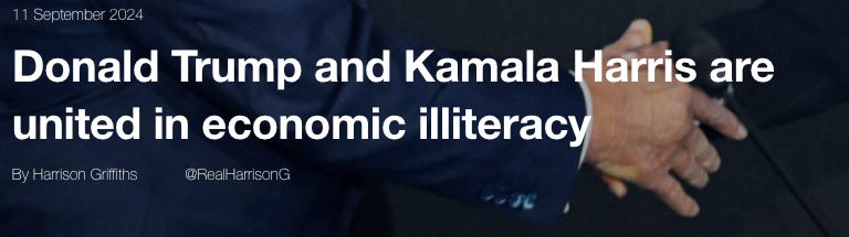 News, Views & Upcoming EventsThe Broken Window Fallacy, IEA International Programmes Manager Harrison Griffiths, IEA YouTube “Schrödinger’s Culture War”, IEA Editorial Director Kristian Niemietz, the Critic “Donald Trump and Kamala Harris are united in economic illiteracy”, International Programmes Manager Harrison Griffiths, CapX “The great greying of the British right”, IEA Editorial Director Kristian Niemietz, City AM “We are already seeing tax increases because people are being dragged into higher tax brackets”, Acting Director of Communications Reem Ibrahim, GB News “Rent Controls: A Well-Intentioned Disaster?”, Acting Director of Communications Reem Ibrahim, FEE What do Mario Draghi and Liz Truss have in common?, Director of International Outreach Adam Bartha, CapX “Zuckerberg secures green light to train AI on public British Facebook posts”, Public Policy Fellow Matthew Lesh quoted in the Telegraph We had a packed room at 2 Lord North St this week for a discussion on Tim Congdon’s new book “The Quantity Theory of Money: A New Restatement”. You’re currently a free subscriber to Insider. For the full experience, upgrade your subscription. Paid subscribers support the IEA's charitable mission and receive special invites to exclusive events, including the thought-provoking IEA Book Club. We are offering all new subscribers a special offer. For a limited time only, you will receive 15% off and a complimentary copy of Dr Stephen Davies’ latest book, Apocalypse Next: The Economics of Global Catastrophic Risks. |