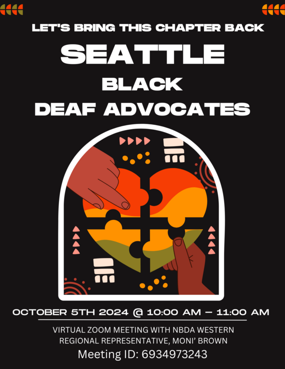 ID: Black background, Text in white, "Let's Bring this Chapter Back Seattle Black Deaf Advcocates, Logo, 4 Puzzle pieces in Heart Shape, red, yellow and green.