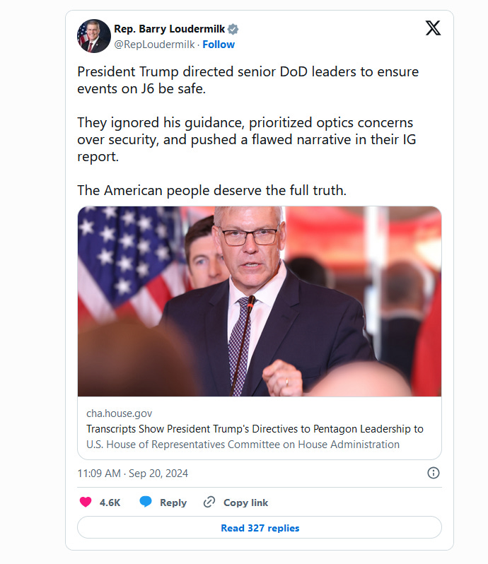 A batch of interviews that took place following the January 6th, 2021 breach at the Capitol have shed new light on former President Donald Trump’s efforts to dispatch authorities tasked with quelling unrest and protecting lawmakers as they certified the 2020 election results. Bombshell testimony released by Congressman Barry Loudermilk (R-GA) on Thursday indicates that President Trump initially requested additional ground support from the National Guard or active duty troops but was rebuffed. The disclosure came while investigators interviewed Gen. Mark Milley, the former chairman of the Joint Chiefs of Staff, who confirmed to the Pentagon inspector general in 2021 that President Trump in an Oval Office meeting pre-approved the deployment. Rep. Loudermilk shared the results of the House GOP’s ongoing investigation with Just The News. “The President just says, ‘Hey look at this. It’s going to be a large amount of protesters come in here on the 6th, and make sure that you have sufficient National Guard or Soldiers to make sure it’s a safe event,’” Milley told the inspector general during the Pentagon’s J6 investigation. He added that then-acting Defense Secretary Christopher Miller assured Trump that the Pentagon had protocol in place to keep the peace in Washington, D.C. that day. “Miller responds by saying, ‘Hey, we’ve got a plan, and we’ve got it covered.’ And that’s about it,” Milley recalled. “‘Just be sure it’s safe,'” Milley claims Trump told his team. “It was just what I just described, which was, ‘Hey, I don’t care if you use Guard, or soldiers, active-duty soldiers, do whatever you have to do.'” Milley sat for two interviews that year, one on April 8th and a second on April 16th, the transcripts of which Rep. Loudermilk obtained as part of a GOP-led probe into what House Speaker Mike Johnson and allies maintain was a politically-motivated congressional committee seeking to lay the blame on Trump. According to Milley, an interagency plan involved positioning National Guardsmen on the streets to direct traffic but not to guard the Capitol building, a plan that was signed off on by Democratic D.C. Mayor Muriel Bowser. “The operational plan was this, let’s take the D.C. National Guard, keep them away from the Capitol. Let’s put — the request, it wasn’t my request, Bowser and her Metropolitan Police Department were like ‘Let’s put D.C. National Guard on traffic control points and at the Metro stations to free up credentialed law-enforcement officers that can go out and arrest people,’” Miller explained, admitting there was a “political calculation” to keep troops away from Congress. “I hate to use the word optics because it’s been used and so prejudicially and negatively. It wasn’t the optics. It was like there was… would have been huge political consequences for that, because that’s what I got paid to do. I had to factor in the politics of this and that was my concern, is the situation does not warrant at this time U.S. military forces,” he explained. In a concurring interview, former District of Columbia Metropolitan Police Chief Robert Contee recalled that it was Army Secretary Ryan McCarthy who resisted his call to station troops around the Capitol. “I received a call directly from the Secretary of the Army Ryan McCarthy and at that time — at that point he had reviewed our request for the support of D.C. National Guard, and what he relayed to me on this phone call was not what I initially thought that he would say,” Contee recounted in his interview. “He did not initially say, ‘Yes, you get the National Guard responding and they’re going to handle this traffic and crowd management that you asked for, that they’re going to be responding to handle it.'” “That was not what was stated. What was stated to me was that he was not inclined to fulfill the request with Guardsmen simply because the optics of it was bad,” Conte added. “He said that he did not want to have boots on the ground on the — he didn’t want to have boots on the ground anywhere near the Capitol is what was stated.” In a social media post, Rep. Loudermilk expressed his concern that there were political considerations at play when high-ranking military figures like McCarthy and others opted to deny requests to put a police force around the Capitol building. “President Trump directed senior DoD leaders to ensure events on J6 be safe. They ignored his guidance, prioritized optics concerns over security, and pushed a flawed narrative in their IG report,” he wrote on X last week. “The American people deserve the full truth. Eventually, McCarthy approved the stationing of 400 Guardsmen throughout D.C. to direct traffic but explicitly stated they were not authorized to use force against protestors. “[D.C. National Guard] are not authorized to perform any additional tasks or duties not authorized in this memorandum,” McCarthy’s staff wrote to the National Guard commander on Jan. 5, 2021. “In addition, without my personal authorization, the DCNG is not authorized the following: a,) to be issued weapons, ammunition, bayonets, and batons. (Removed body armor and helmets),” he wrote in a December 2020 email. “Addition: DCNG Soldiers have the inherent right to self‐defense. DCNG Soldiers will store their helmets and body armor within vehicles or buildings in close proximity to their positions. In the event of an elevation of the threat requiring immediate donning of this equipment for self‐defense, DCNG leadership will immediately notify the Secretary of Army,” that email read. As violence escalated that day, it took the Pentagon several hours to deploy hundreds of additional troops. Before they could reach the Capitol, rioter Ashlee Babbitt, a Trump supporter, was shot and killed by a Capitol police officer. DC Homeland Security Coordinator Christopher Rodriguez also told Pentagon investigators in 20