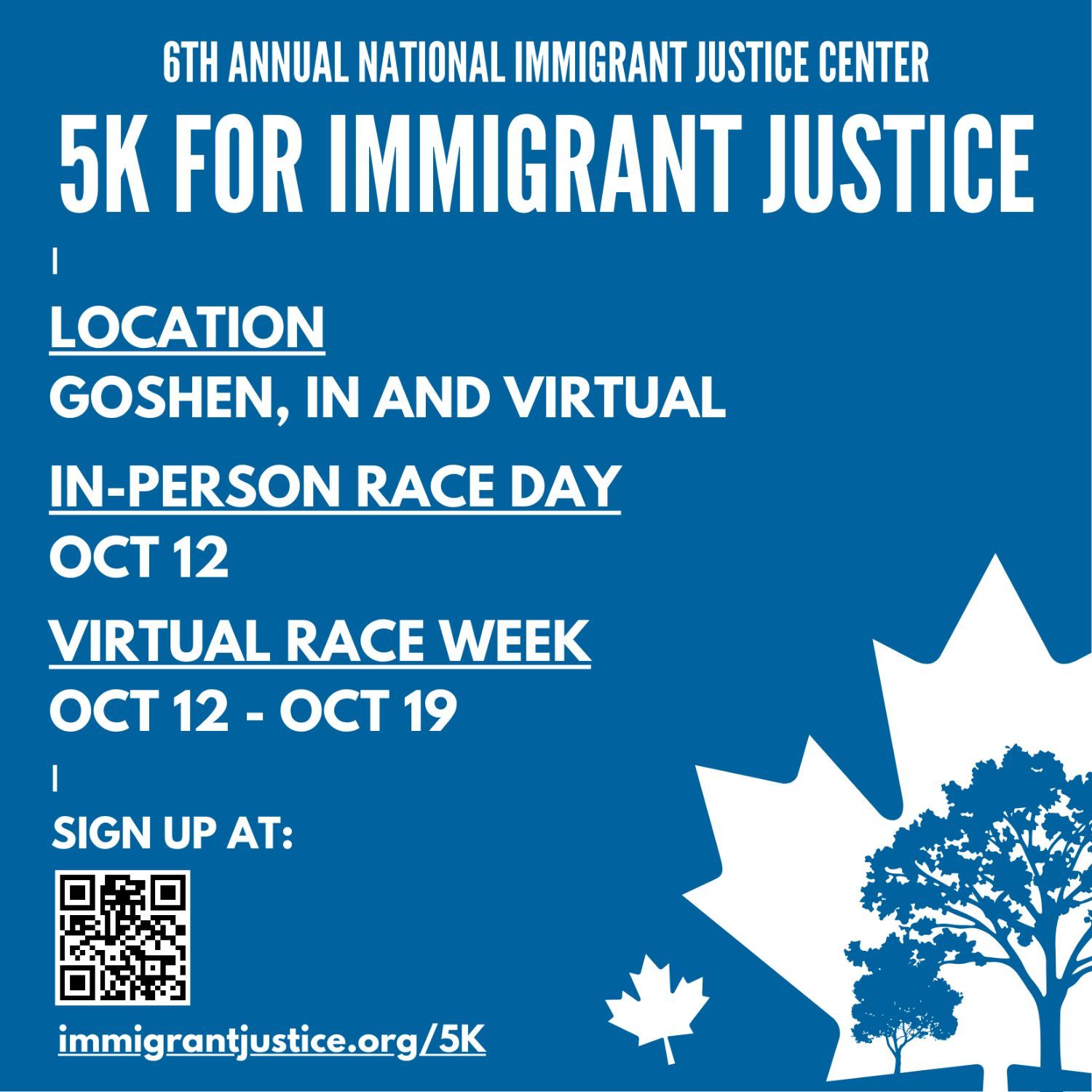 Hi John, the 6th Annual National Immigrant Justice Center (NIJC) Community 5K for Immigrant Justice is two weeks away! And we have good news, it's not too late to register and join us in person in Goshen, IN or virtually: https://immigrantjustice.org/5K. Don't miss out! Here are the details of the 5K for Immigrant Justice: Join us in person on race day, Saturday, October 12, 2024 at 11:00 a.m. ET at Millrace Trail in Goshen, Indiana OR join us virtually and do your race on your favorite route or trail near you anytime during race week, Saturday, October 12, 2024 through Saturday, October 19, 2024. |
