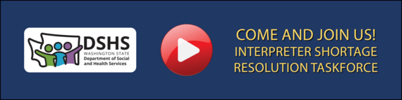 ID: Blue background, white DSHS Logo, yellow text: Come and Join Us! Interpreter Shortage, Resolution Taskforce. Tap Play to watch in ASL