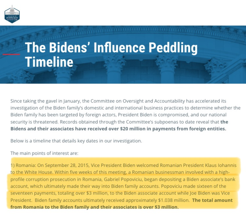 In 2015, Hunter Biden was receiving regular payments from Ukrainian gas company Burisma and from Gabriel Popoviciu, a Romanian businessman under prosecution. Special Counsel Weiss has since revealed evidence that Hunter “received compensation from a foreign principal who was attempting to influence U.S. policy and public opinion and cause the United States to investigate the Romanian investigation.” Would the photos of Jim Biden at a White House visit relate to the Romanian President visiting then-Vice President Biden at the White House in 2015?