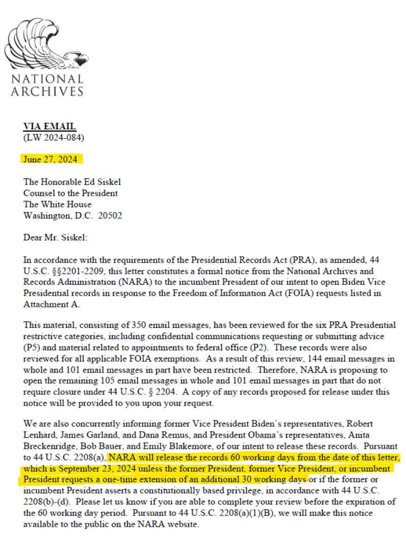 NARA’s June 27, 2024 notification related to a tranche of then-Vice President Biden’s records that would have been released last week. The Presidential Records Act invocation pushes the deadline to November 6, 2024 (the day after Election Day).