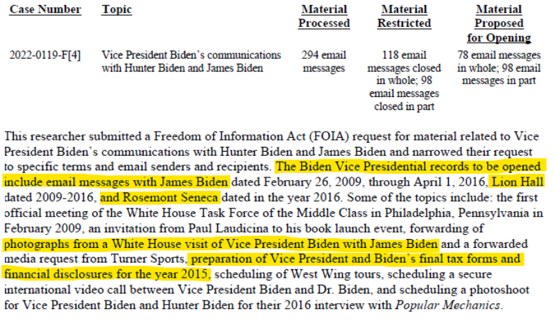 Again, NARA described these “Biden Vice Presidential records” as “email messages with James Biden …, Lion Hall …, and [Hunter’s firm] Rosemont Seneca,” about “photographs from a White House visit of Vice President Biden with James Biden [and] preparation of Vice President and Biden’s final tax forms and financial disclosures for the year 2015.”