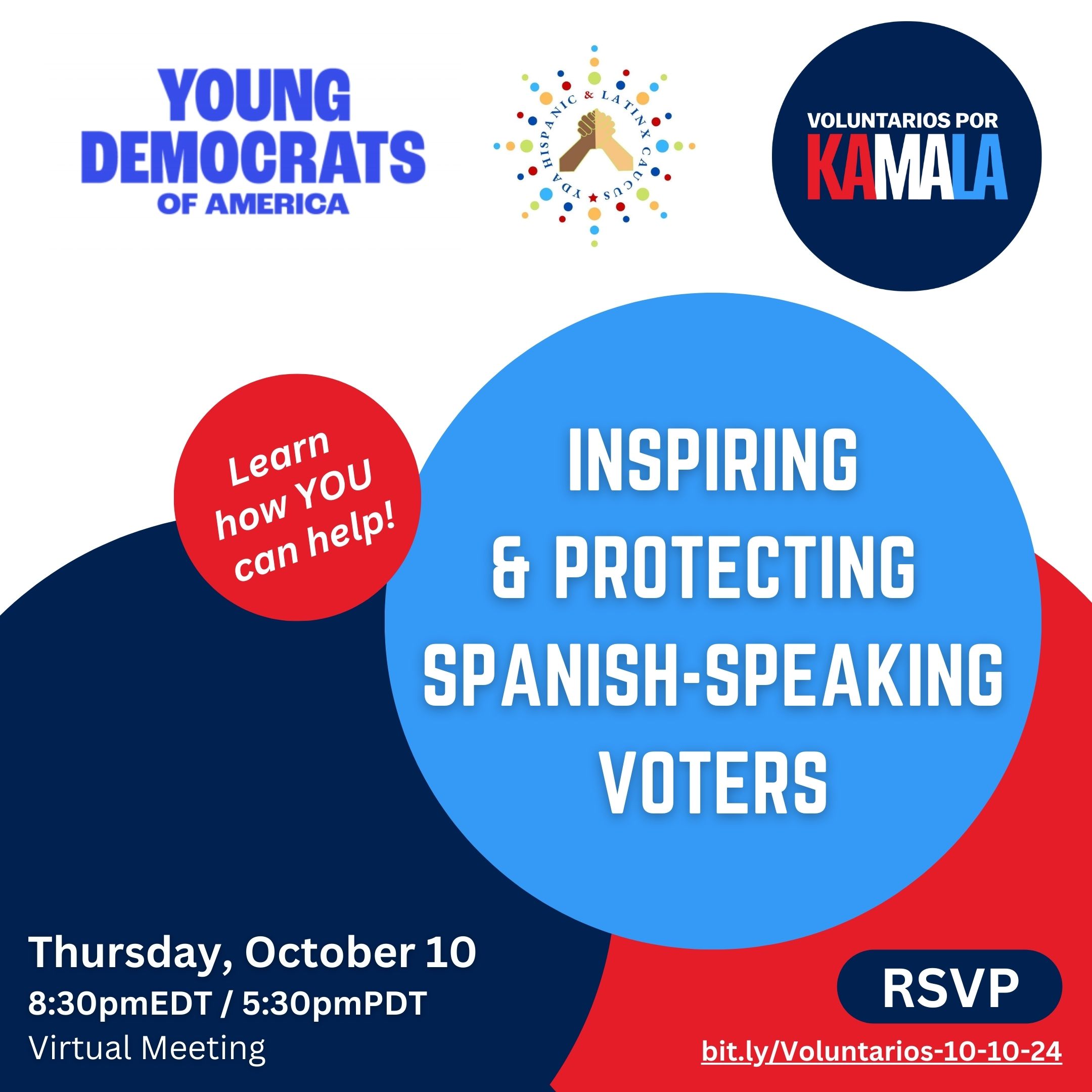 Join Voluntarios por Kamala and the Young Democrats of America Hispanic & Latinx Caucus to learn about virtual and in-person opportunities to empower and protect Spanish-speaking voters. Nuestros Voluntarios are being deployed in swing states and beyond to meet the highest priority needs of the campaign and los votantes hispanohablantes. From canvassing en comunidades hispanas; to calling into swing states; to answering voter questions on national and state hotlines; to serving as poll observers, ballot monitors and more, there are numerous ways to get involved this election season and your help is urgently needed en espa?ol. Please join our call to learn how you can be part of this meaningful work and connect with our community of dedicated volunteers. ?