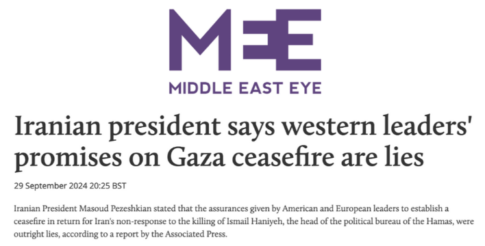According to the Associated Press, The US promised Pezeshkian that if Iran did not retaliate on Haniyeh’s murder, Iran would receive massive sanctions relief along with a negotiated ceasefire in Gaza. Look at what it got them: