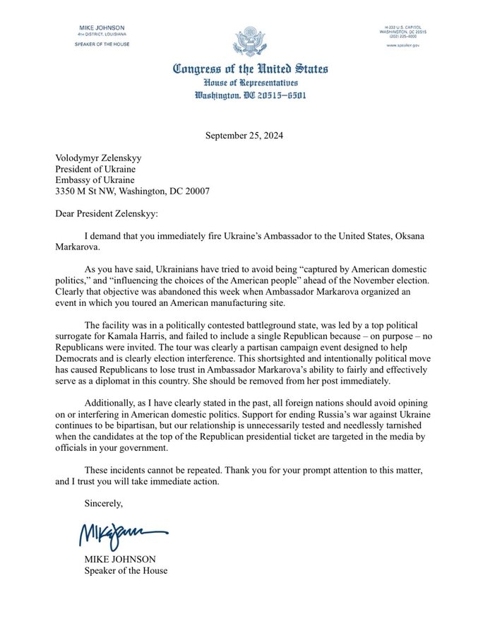 | After Ukrainian Ambassador Oksana Markarova organized a tour of an American manufacturing site in a political battleground state, led by a top political surrogate for Kamala Harris, and purposely excluded Republicans, I wrote to President Zelenskyy that Republicans have lost trust in the Ambassadors' ability to fairly and effectively serve as a diplomat in this country and demanded that Zelenskyy immediately remove her from her position. | For three years, House Foreign Affairs Committee Republicans have carefully and methodically investigated the Biden-Harris Administration’s failed withdrawal from Afghanistan that tragically claimed the lives of 13 American servicemembers and weakened America’s standing on the world stage. The investigation affirmed that the Biden-Harris Administration failed in its duty to protect our soldiers and State Department personnel, and deliberately lied to the American people about their mismanagement and failed strategy. | To honor the 13 brave American servicemembers killed in the Kabul airport terrorist attack on August 26, 2021, I hosted a bipartisan Congressional Gold Medal Ceremony at the U.S. Capitol where we presented the Gold Star Families with the Congressional Gold Medal - the highest honor Congress can bestow upon any American citizen. Watch that ceremony here. | In late September, I joined the Arkansas delegation, Gov. Sanders & the Cash family to unveil a statue of Johnny Cash in the Capitol. Standing tall with Bible in hand, the "Man in Black" reminds us that America isn’t just about law & politics, but about the American people & their stories. He is the first musician to have a statue in the U.S. Capitol. Although he was an Arkansan, Johnny Cash also had a special connection to Shreveport, Louisiana. Cash was a regular performer at the Louisiana Hayride alongside the Tennessee Two. And on New Years Eve in 1955 he performed in one of the most famous shows in Hayride history - he took the stage alongside Elvis Presley, Johnny Horton, George Jones, and David Houston. The tickets were only 60 cents! | I sat for a number of television and radio interviews to discuss our work in the House recently and also delivered a speech about House Republicans 2025 economic agenda to the America First Policy Institute. See below for a collection of those conversations. Click the images to watch, and check our YouTube channel for more. | America First Policy Institute (AFPI) Speech | Fox News: Fox and Friends | We received sad news last week with the passing of Justice Jeffrey Victory. Justice Victory was a friend to all, a talented legal scholar, and someone who cared deeply about the people of Louisiana. I will always cherish his wisdom and mentorship. Our prayers are with Nancy and the entire Victory family. We lost a great man last week. Click here to read his full obituary. | Rep. Mike Johnson Speaker of the House | Sign up for my newsletter to get updates from Washington! | Bossier City 2250 Hospital Drive Suite 248 Bossier City, LA 71111 (318) 840-0309 | Washington, DC 568 Cannon House Office Building Washington, DC 20515 (202) 225-2777 | Northwestern State University 444 Caspari Drive South Hall Room 224 Natchitoches, LA 71497 (318) 951-4316 | Northwestern State University - Ft. Johnson 3329 University Parkway Building 552, Room 24 Leesville, LA 71446 (337) 423-4232 | |