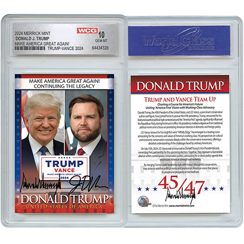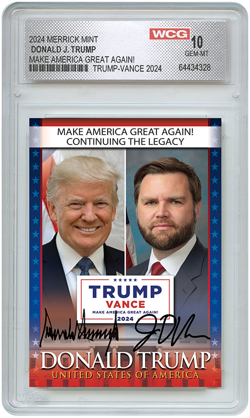 Own a piece of history today with our official collectible Trump Vance 2024 trading card - graded GEM-MT 10!